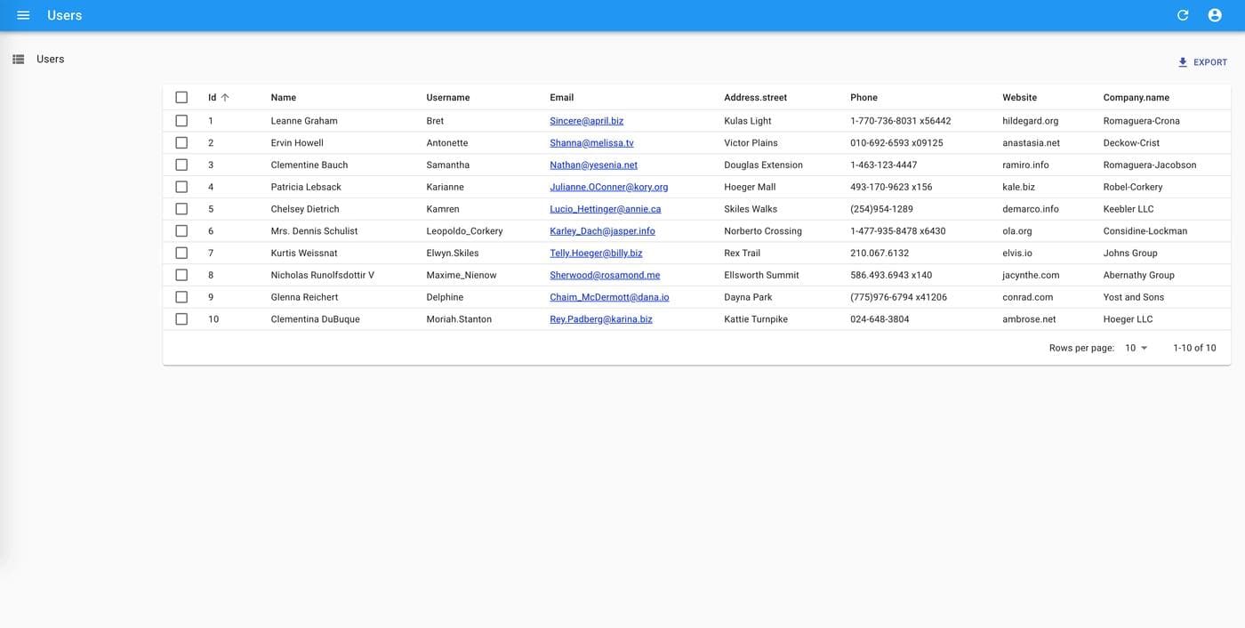 1 2 3 4 5 6 7 8 9 10 11 12 13 14 15 16 17import React from 'react'; import { List, Datagrid, TextField, EmailField } from 'react-admin'; export const UserList = props => ( <List {...props}> <Datagrid rowClick="edit"> <TextField source="id" /> <TextField source="name" /> <TextField source="username" /> <EmailField source="email" /> <TextField source="address.street" /> <TextField source="phone" /> <TextField source="website" /> <TextField source="company.name" /> </Datagrid> </List> );