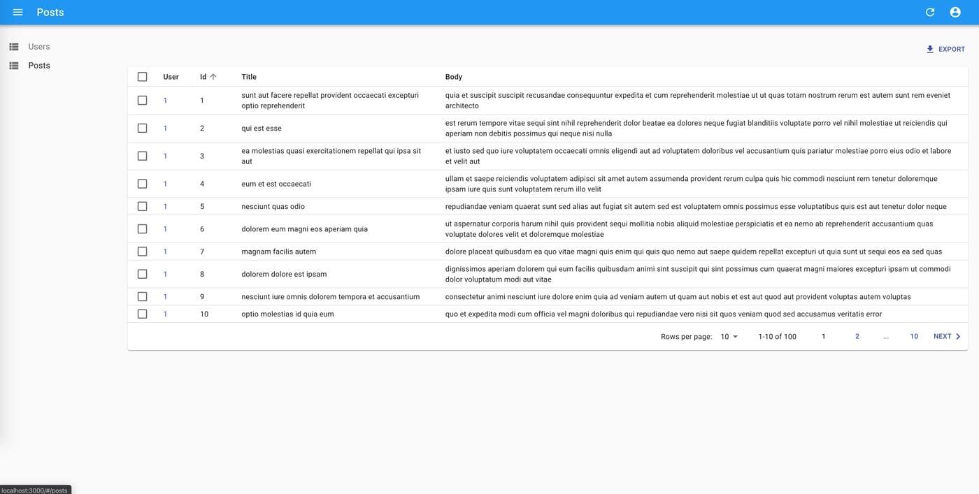 1 2 3 4 5 6 7 8 9 10 11 12 13 14 15 16 17 18 19import React from 'react'; import { Admin, Resource,ListGuesser } from 'react-admin'; import jsonServerProvider from 'ra-data-json-server'; import {UserList} from "./components/users"; //connect the data provider to the REST endpoint const dataProvider = jsonServerProvider('https://jsonplaceholder.typicode.com'); D function App() { return ( <Admin dataProvider={dataProvider}> <Resource name="users" list={UserList}/> <Resource name="posts" list={ListsGuesser}/> </Admin> ); } export default App;