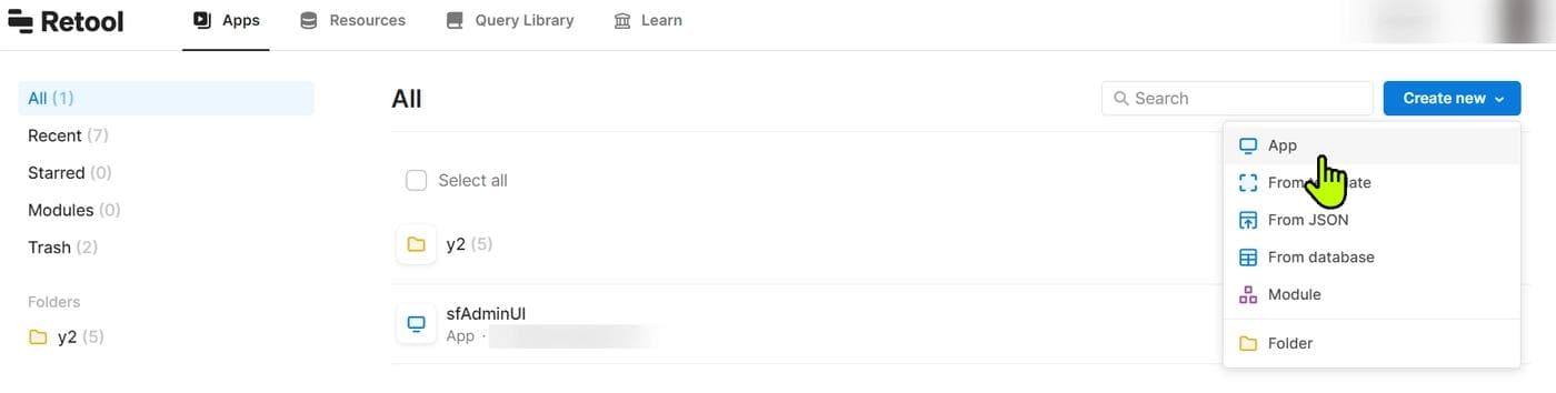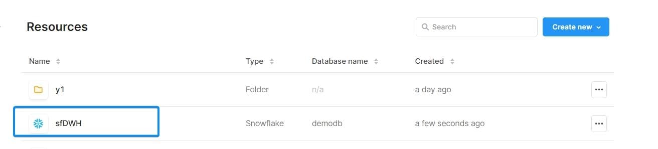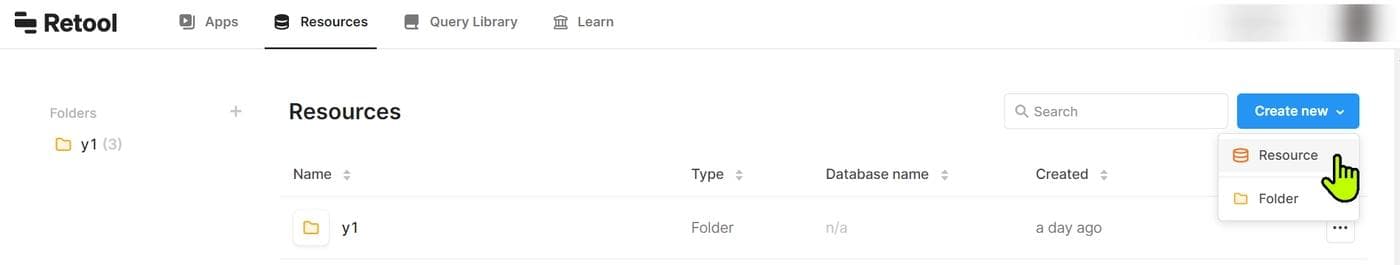 Retool has a native Snowflake connector. To establish this connection, you must first create a resource in Retool. To do this, log into your Retool account, and in the top menu bar, click on the Resources tab, then Create New, and then Resource.