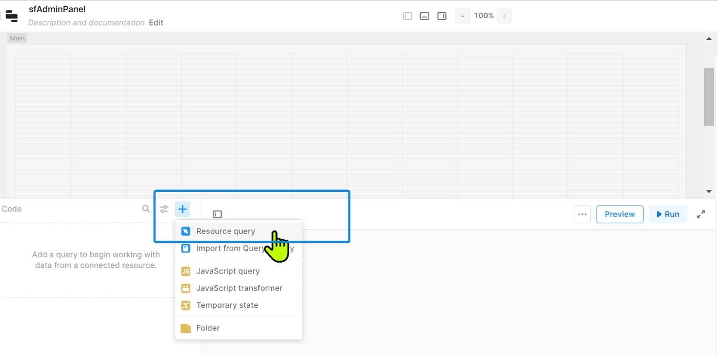 To create the update query, create a new "Resource Query" similar to the "getData" query created earlier. However, use the GUI mode for any DML operations like insert/update/delete.