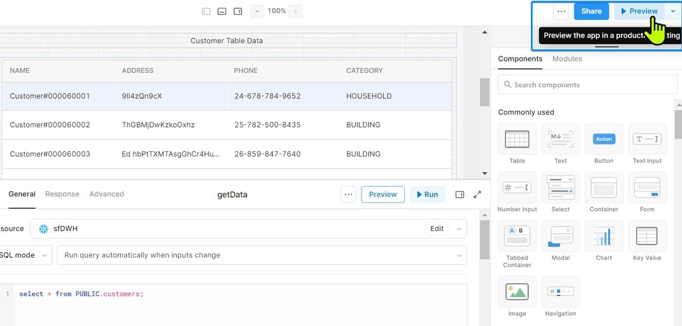 With Snowflake successfully connected to Retool, you can now create an admin panel app for accessing Snowflake data.