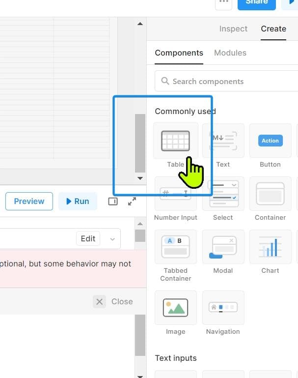 Open the panel on the right side, select the Text Input component, and drag it to the canvas. You can place it either at the top of your table view or below it.