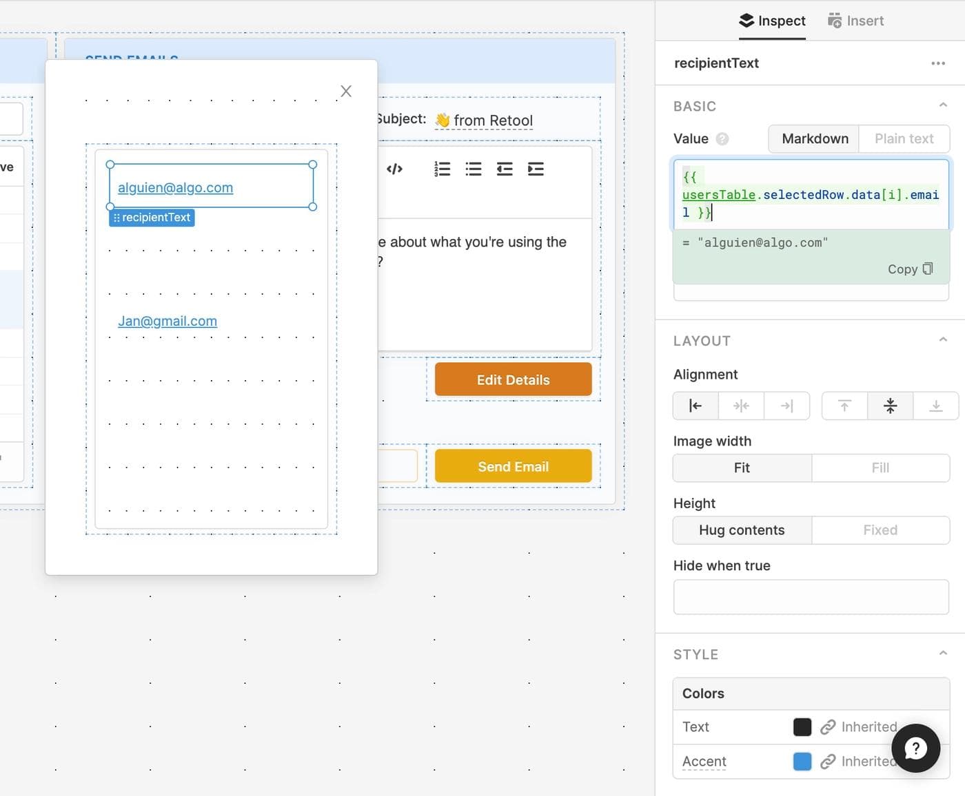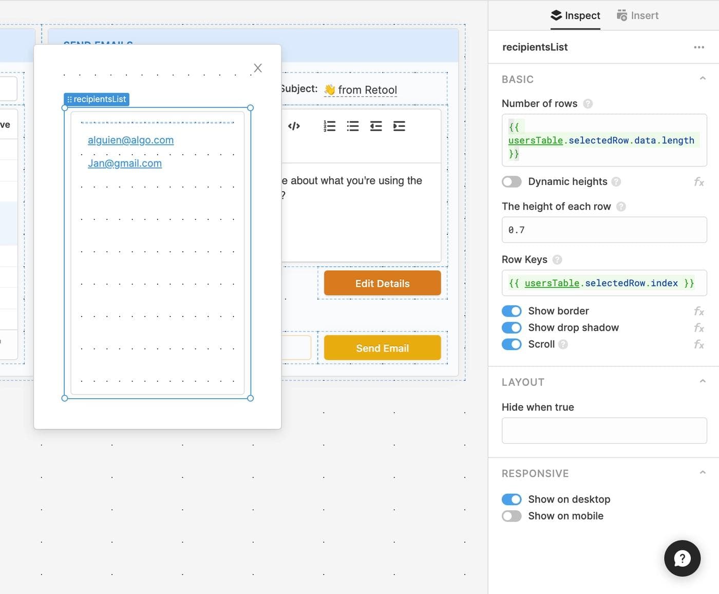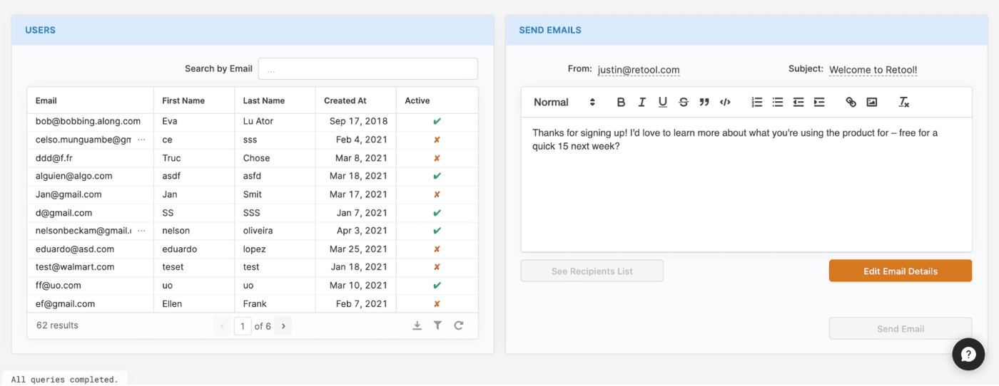 On the left, we’re pulling a list of users from a Postgres DB. On the right, we’ve got a rich text editor for writing your emails, a modal to edit email details, another modal for viewing selected recipients, and a big ol’ button to send emails out to the users selected in the table.