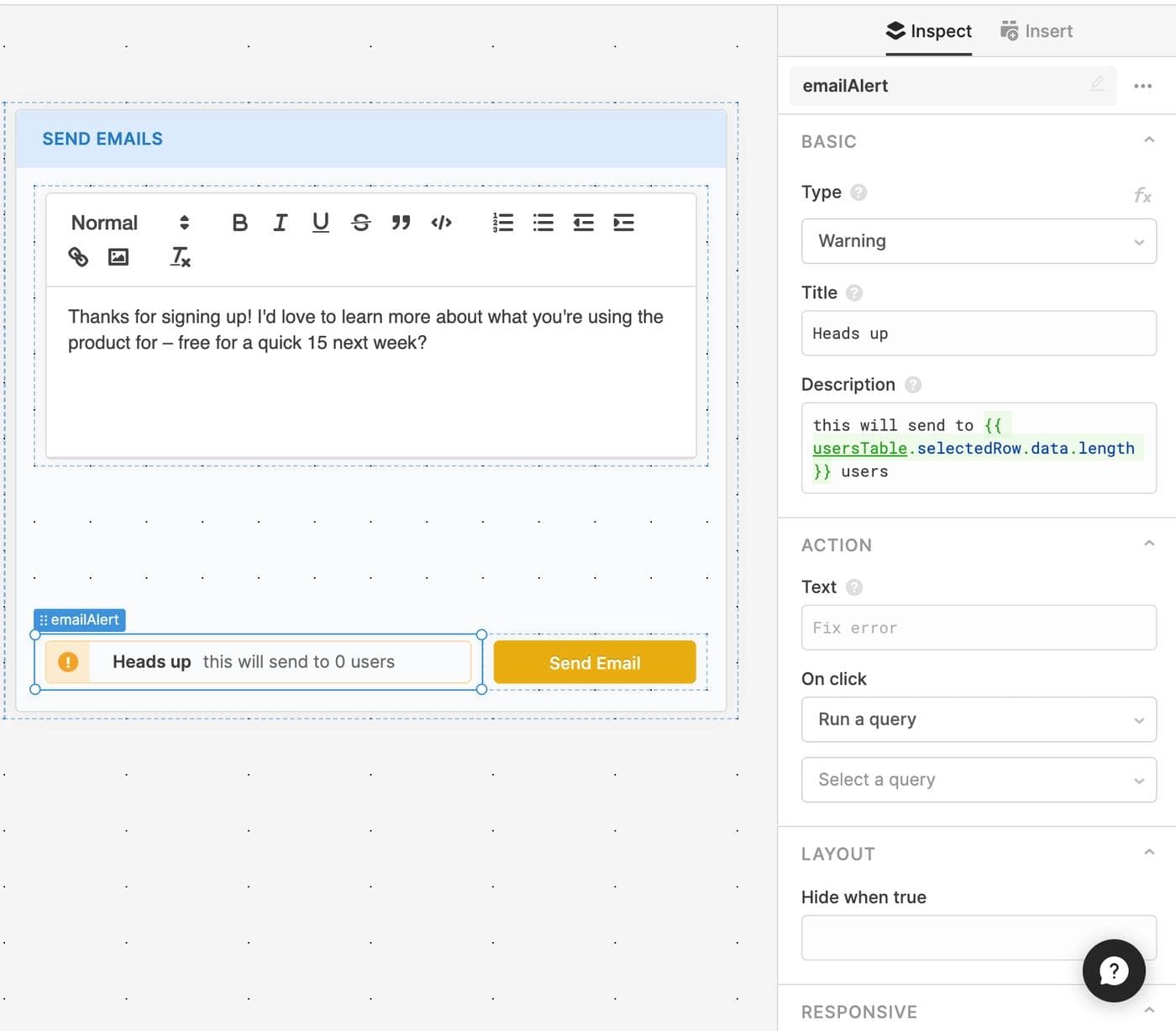 We’ve updated the alert type to “Warning” and added “Heads up” as the title. In the “Description” field, you can add a little Javascript that references the number of selected rows in our users table, which will be the number of users we’re sending emails to. If you want to get really fancy, you can add in a ternary operator that changes “users” to “user” if there’s only one row selected: