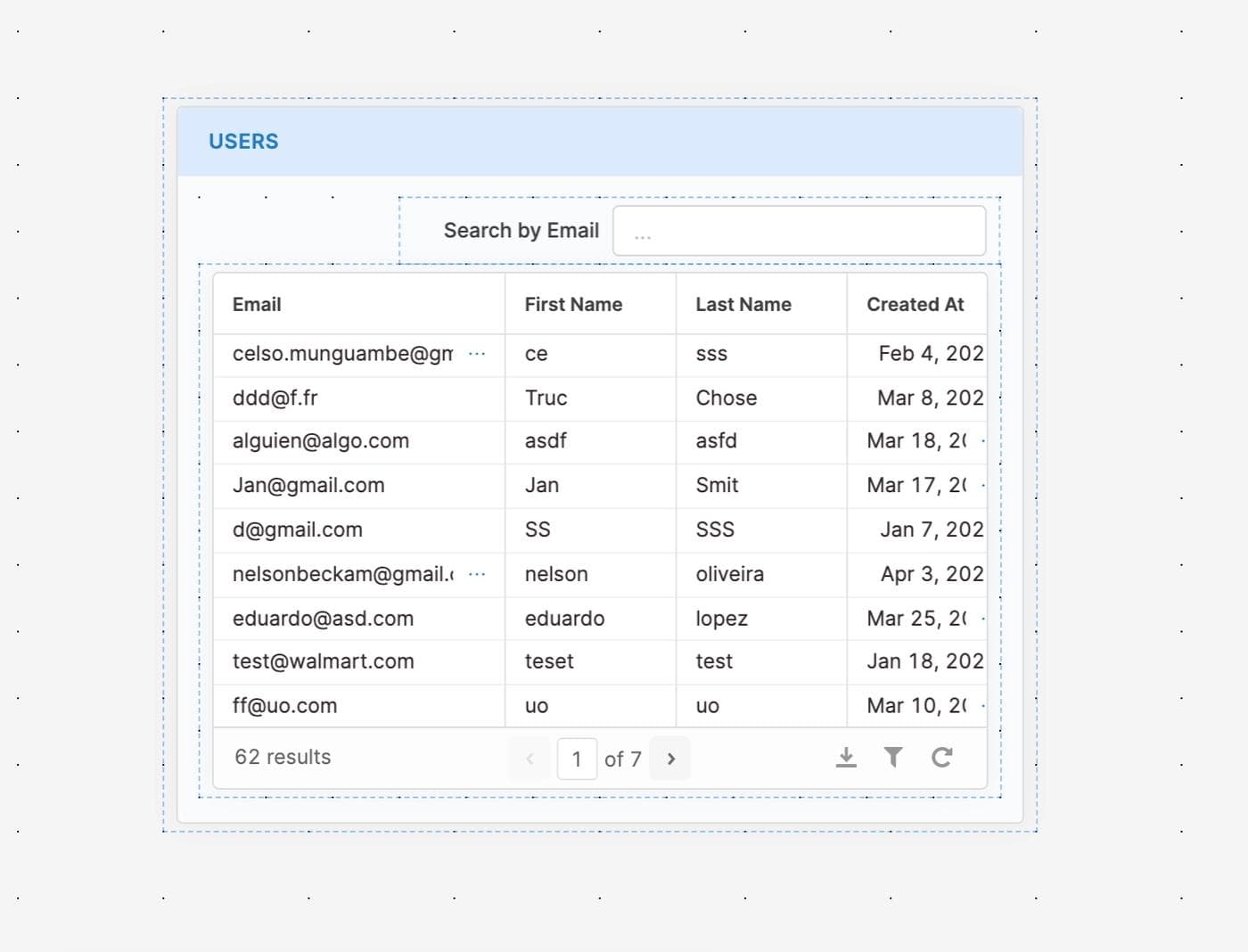 To send emails, we’ll need people to send them to. The basic UI we’re going to build is a table to display our users and a search input to filter by email.