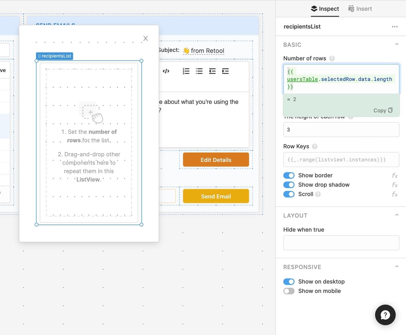 Start by dragging another modal component onto the canvas. Inside of this one, we’re going to add a listview component – it lets us create an arbitrarily long repeating list of components. In our case, it’s going to be a list of all of the emails we’ve selected from the table.