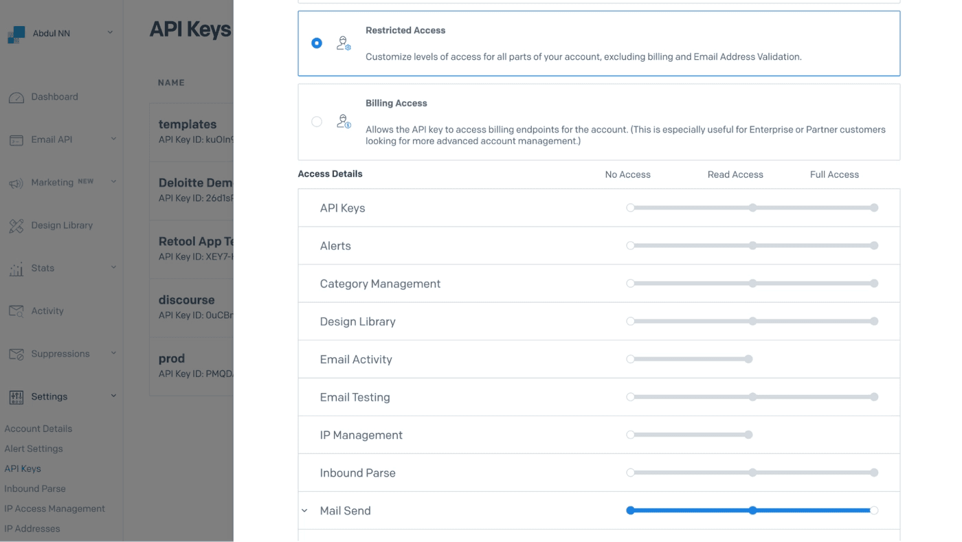 To get started, head to your SendGrid account and click on Settings → API Keys (or you can go straight to this link). Click on the “Create API Key” button, and choose the level of access you want to give your key. Here we’ve chosen “Restricted Access” (which lets us set domain specific permissions), and given the key full write access to mail send APIs (which is the whole point of our app).