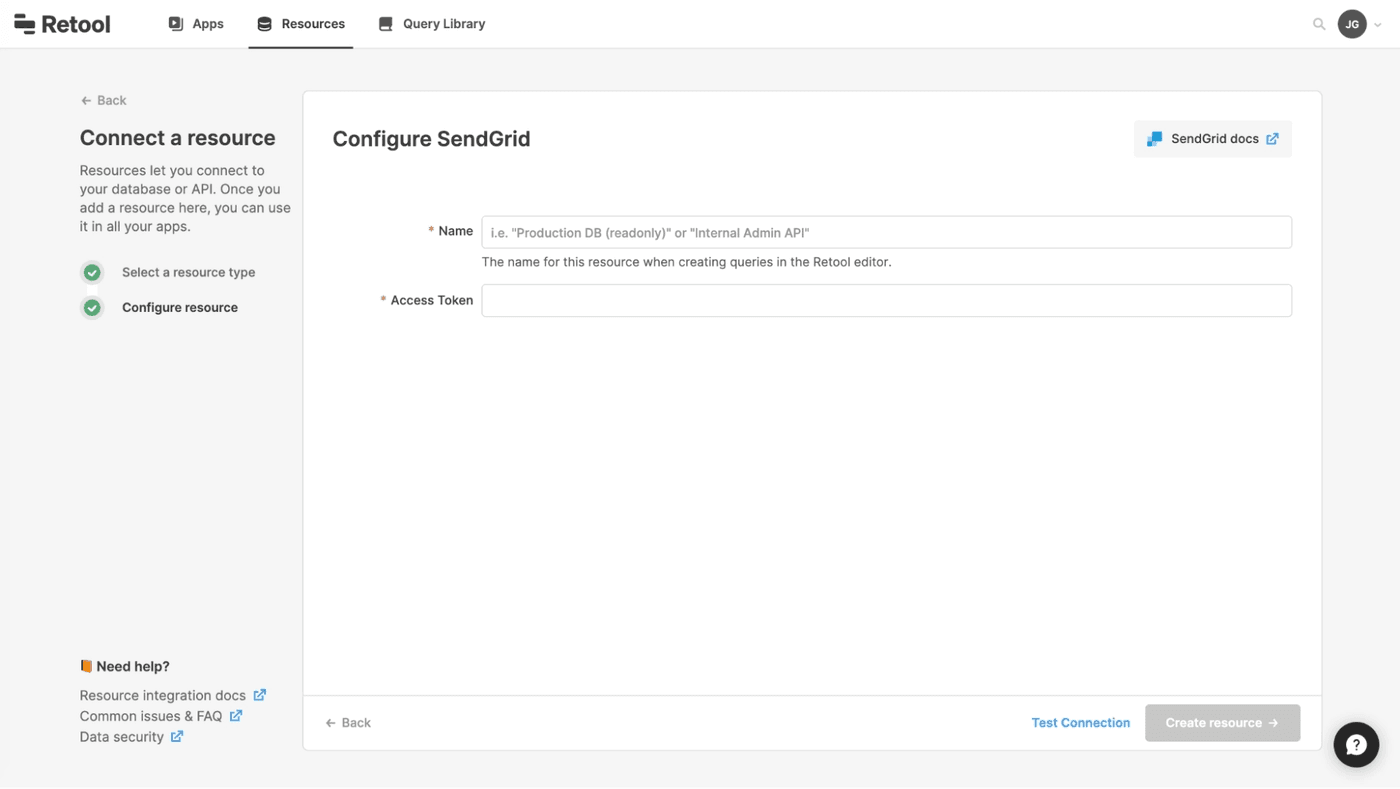 Once you’ve got your API key from SendGrid, head over to your Retool account and click on the “Resources” top nav. Click the “Create new” button and find the SendGrid option. You’ll be prompted for a name and your key.