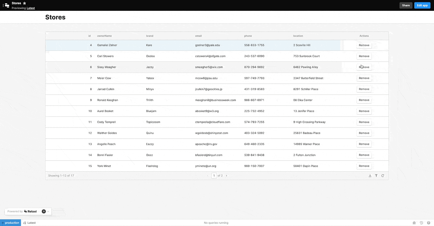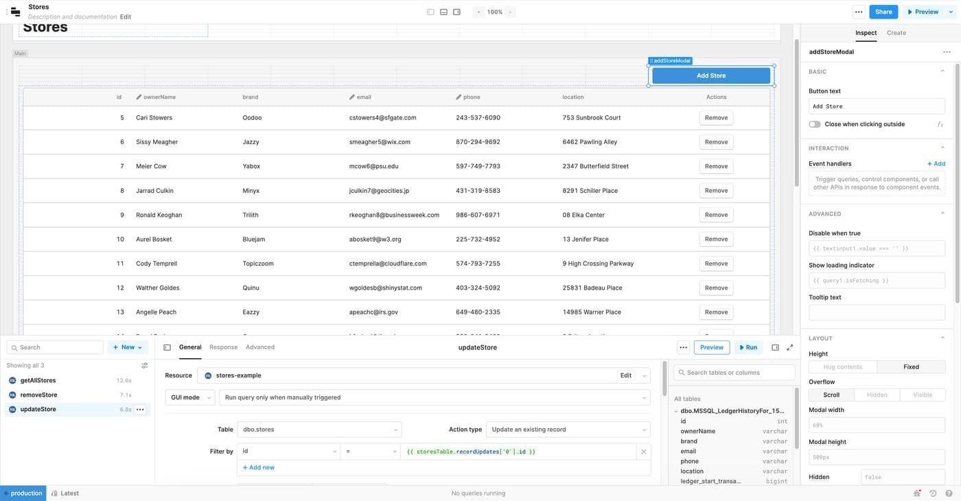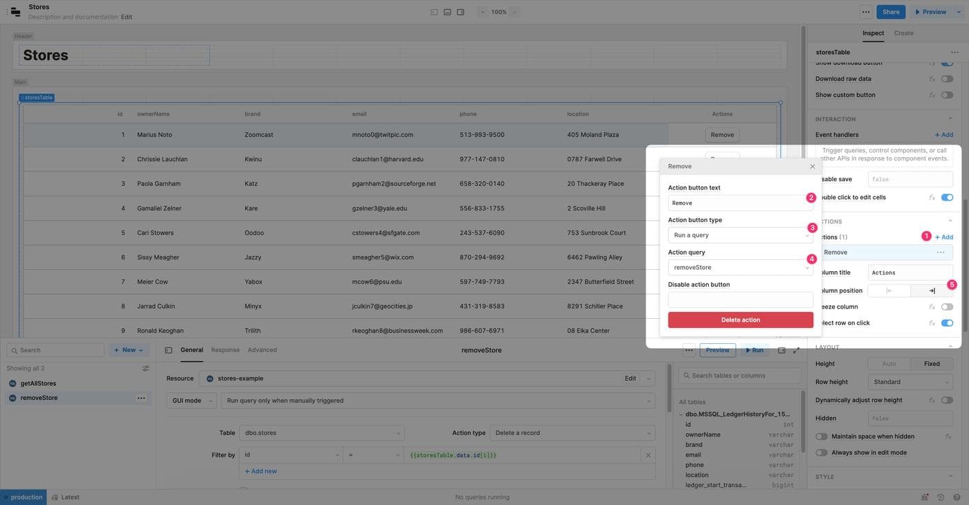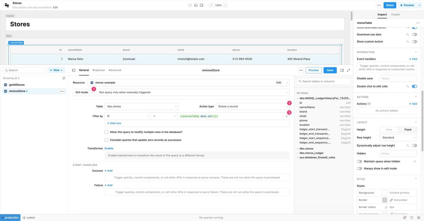 When a store is shut down, the admin will have to remove the store from the database. To add this feature, create a new query removeStore using the GUI mode feature of the Retool query editor, select dbo.stores as the Table, and Delete a record as the Action type. Set Filter by id = {{ storesTable.data.id[i] }}. This will provide this query with the id of the selected row from the storesTable.