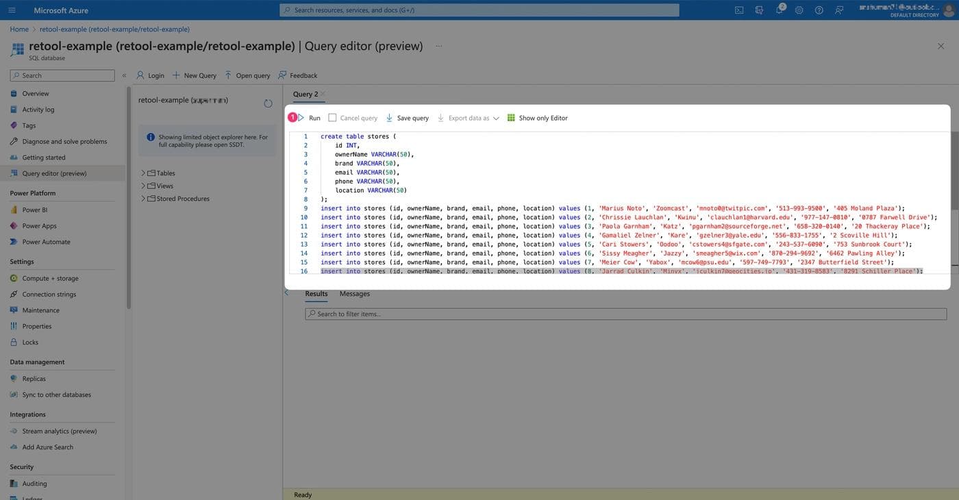 In the query field, paste the following SQL queries to create a new stores table and insert the mock data. Click Run to execute the queries:
