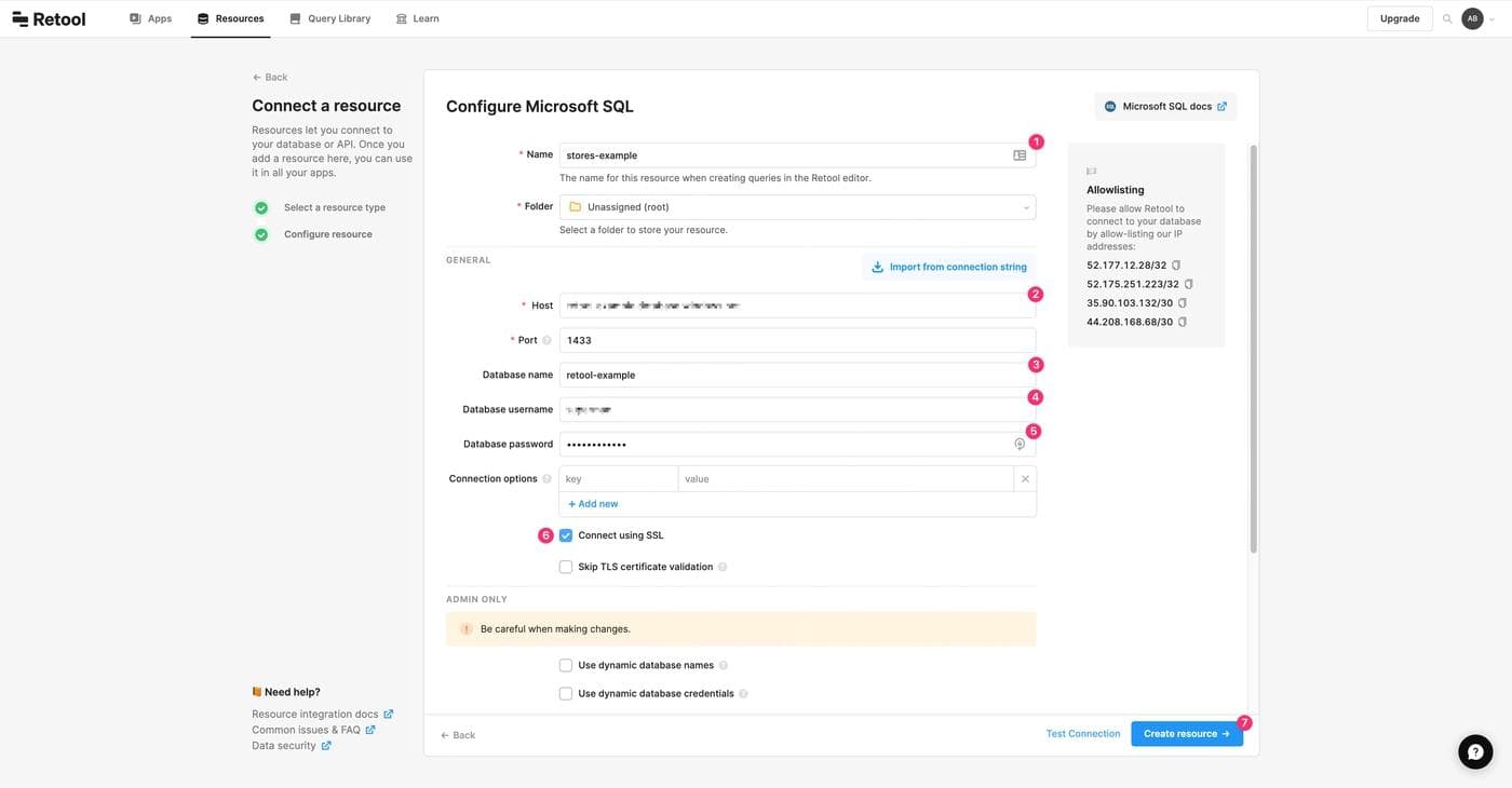 Check the Connect using SSL option to enable an encrypted connection to the database. Before finishing the form, you need to add the Retool IP addresses to your Azure database server's allowlist.