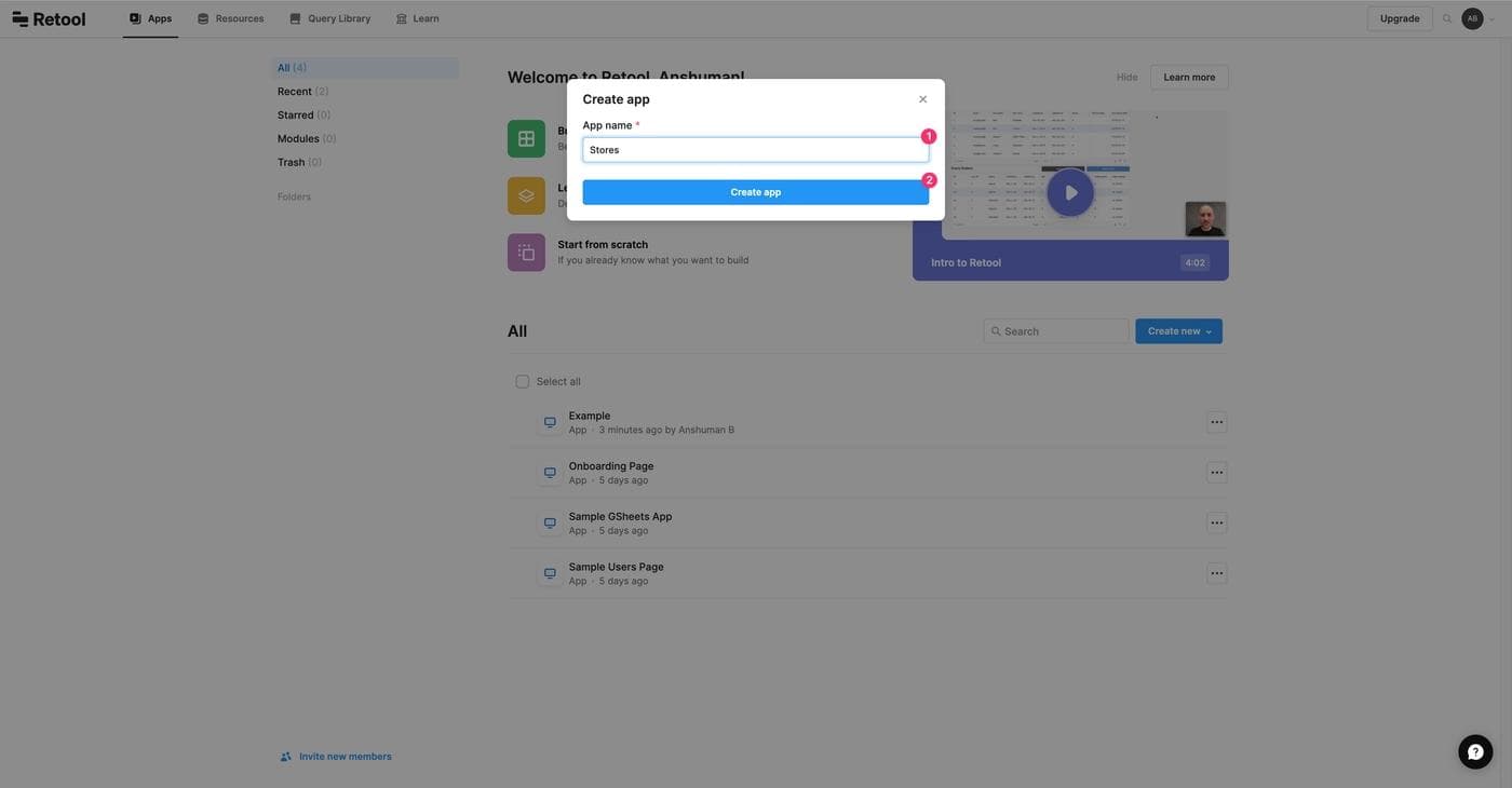 On your Retool dashboard, click on the Apps tab on the top navigation bar.