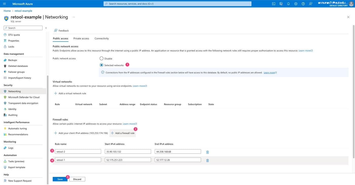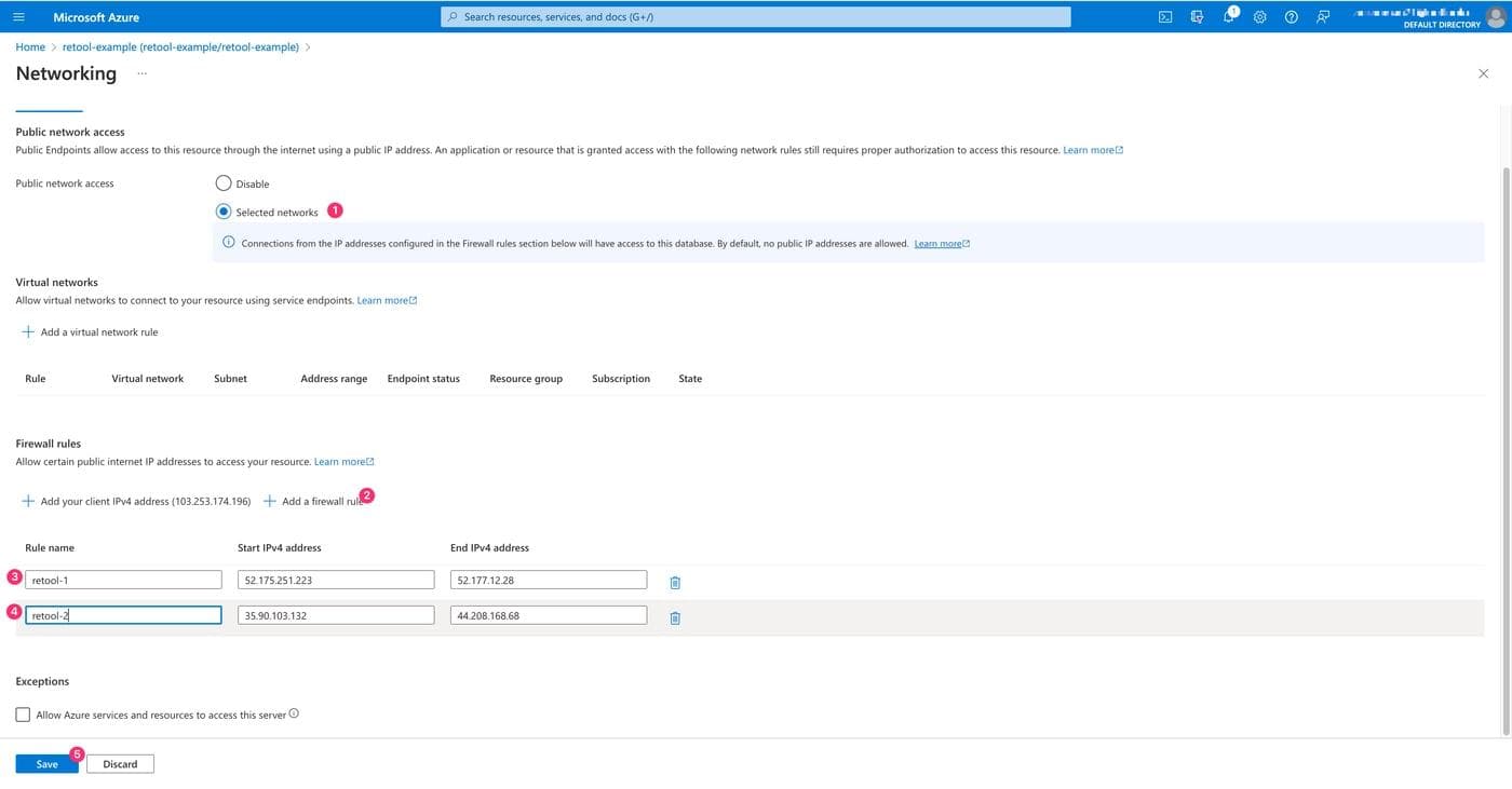 To do that, go to the Networking page of the database server and choose Selected networks under Public network access. Then click Add a firewall rule to add the IP addresses range shown on the Connect a resource page on Retool. Once that's done, click Save to save the configuration.