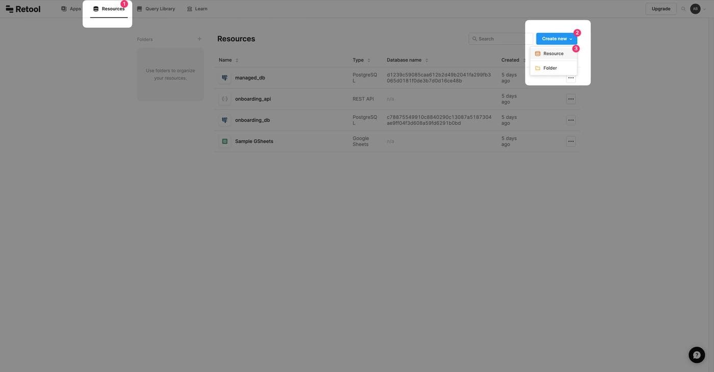 Now that you've got the database ready, it's time to create and connect the SQL server to Retool. To do that, log in to your Retool account and go to the Resources page by clicking on the Resources tab on the top navigation. On this page, hover over Create new and click Resource.