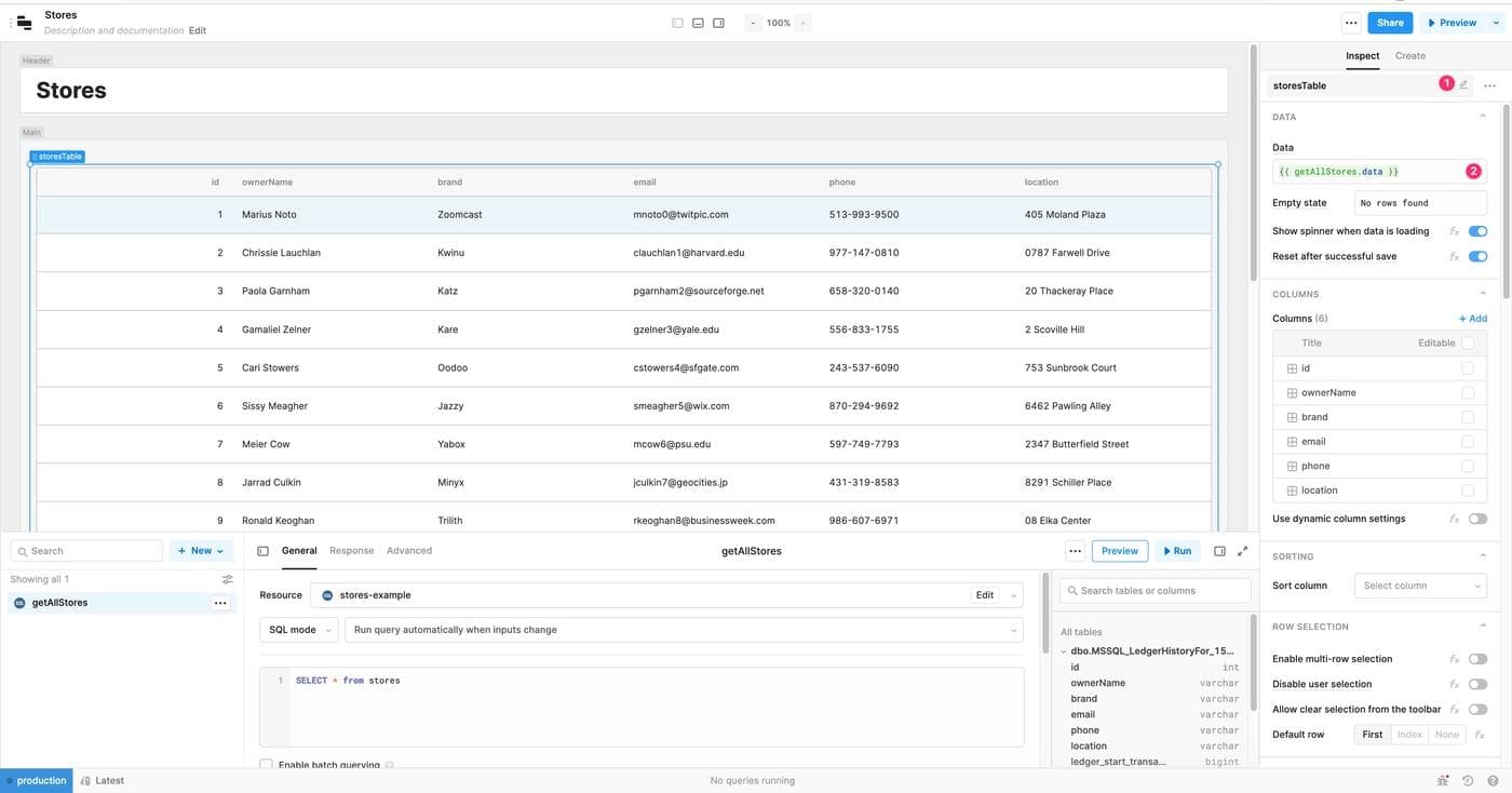 Now that the getAllStores query is ready, drop a Table component from the right pane in the Main section of the application editor. Rename the Table component to storesTable for easy access and specify {{ getAllStores.data }} as the Data field for this component. You'll see that the table automatically shows the data fetched from the stores table of your database.