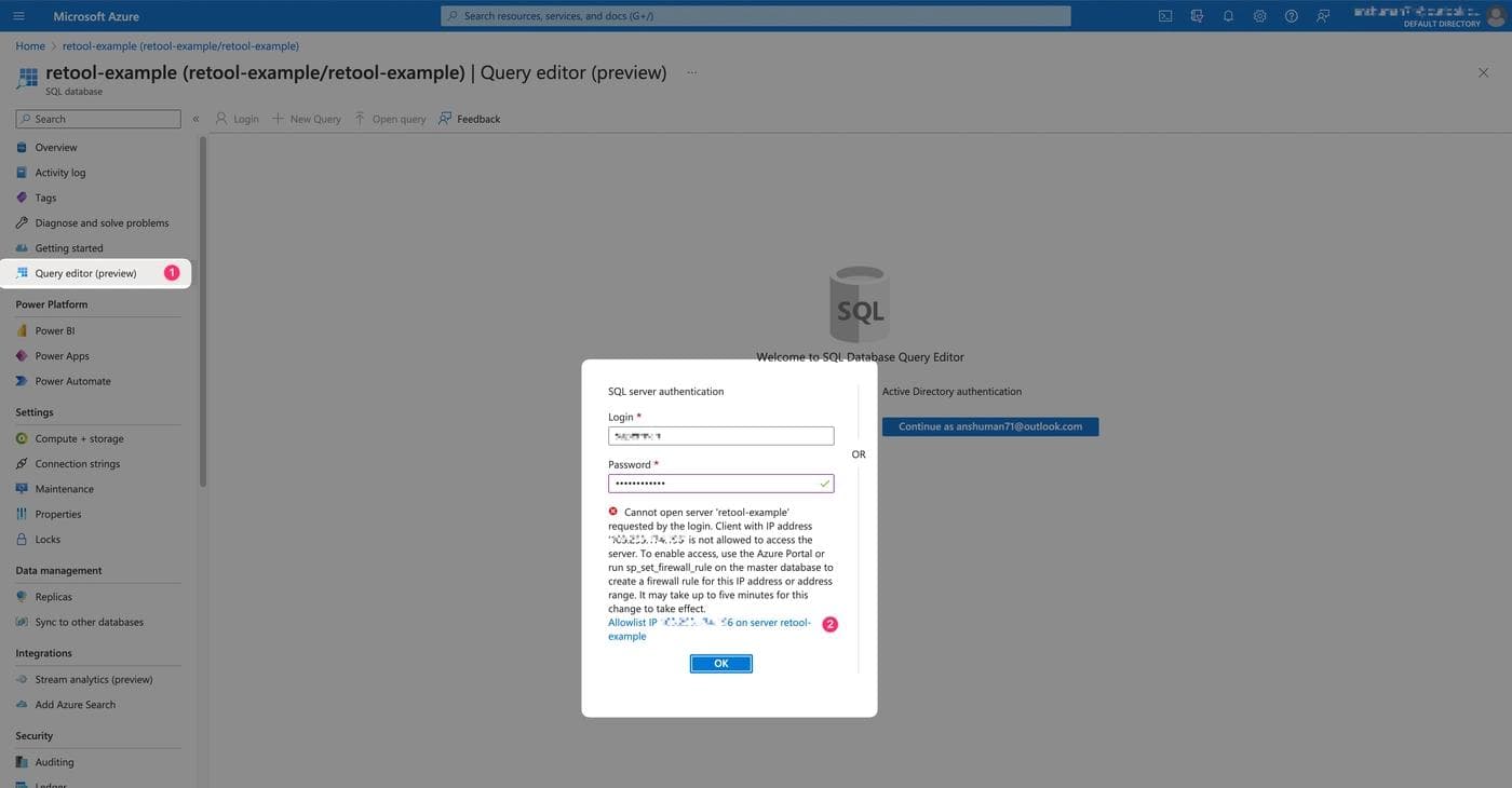 Now log in with the admin credentials you created in the previous step. You might get an error because the database server doesn't allow access from any public address, so you'll see an error on the first attempt. Click on Allowlist IP: on server retool-example in the error message to proceed. Then click OK.