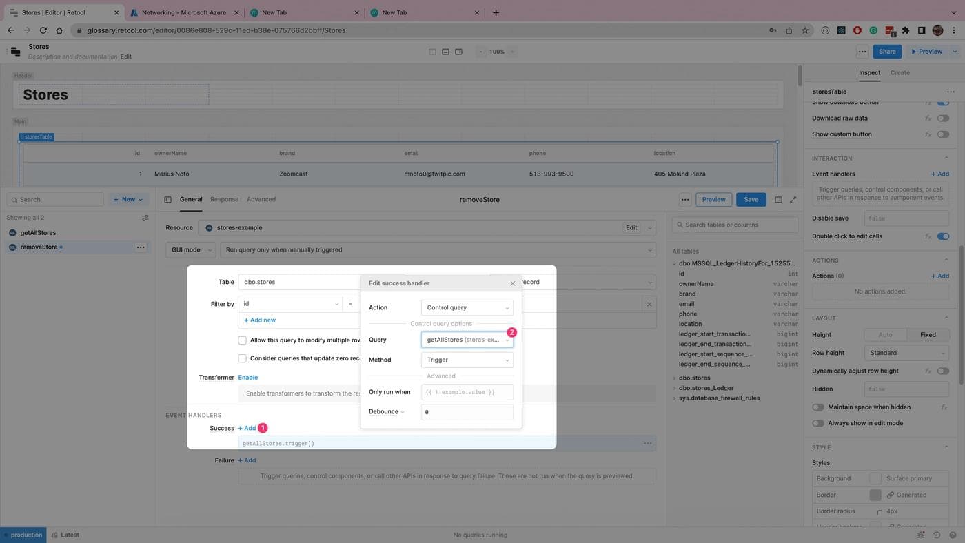 In the Event Handlers section of the query editor, click on Add next to Success to add an event handler to trigger the getAllStores query when the removeStore query runs successfully. This will refresh the table with the latest data after removing a store.