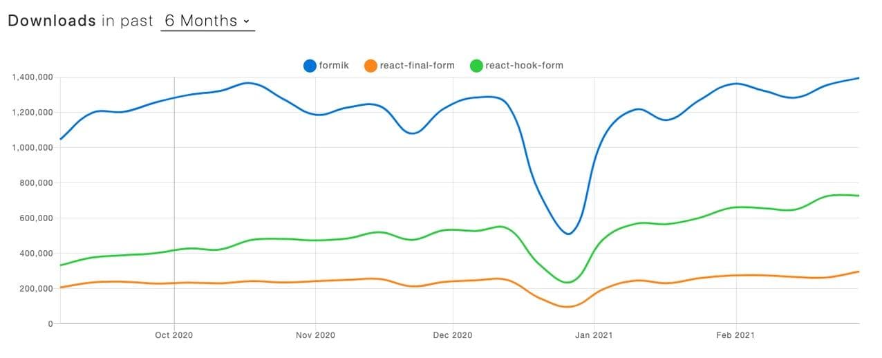 As you can see, Formik is by far the most popular in terms of usage among the three React form libraries. React-hook-form is the next-most-used form library, even though it’s relatively new.
