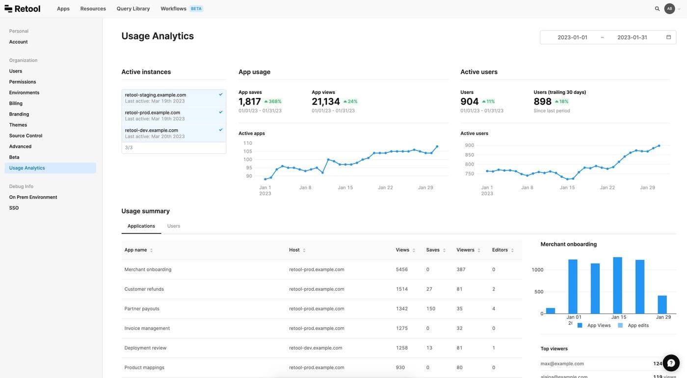It’s crucial to understand your Retool adoption so you can identify trends and know when to take action. This is especially important as more teams in your organization build and use Retool apps, and as you deploy Retool across multiple self-hosted instances.