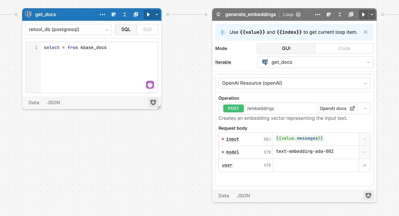 Our next step was to generate embeddings of the threads and store those embeddings in the vector database. The OpenAI embeddings API accepts text as an input and returns a vector, so we used a Retool Workflow to iterate through each thread, shipping each thread to the embeddings API for vector representation. We then uploaded the vectors to our vector database. Building this workflow took less than an hour, largely because we didn’t need to fuss with complex database connections, and we could use visual programming concepts like the loop block to ship faster.