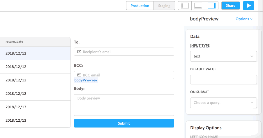 This lets us have auto-fill our email body with some variables depending on which row is selected. To access the return_date, for example, we can just use: {{ returnsTable.selectedRow.data.return_date }}. Now let’s put this inside of our body: