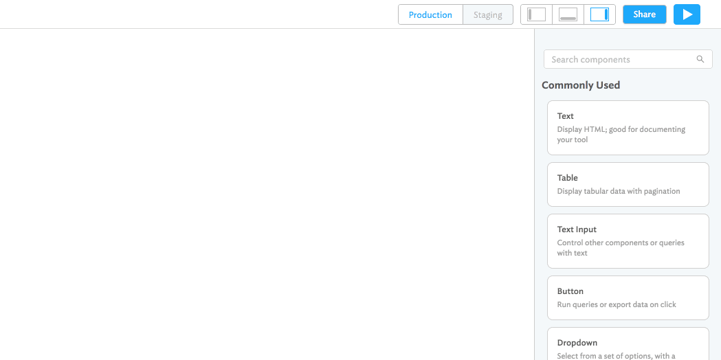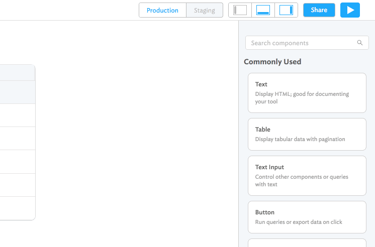 Retool has ready-made components that can display data however you want. You can combine and arrange components to create custom interfaces for your own apps. For now, let’s show our Sheets data in a table.