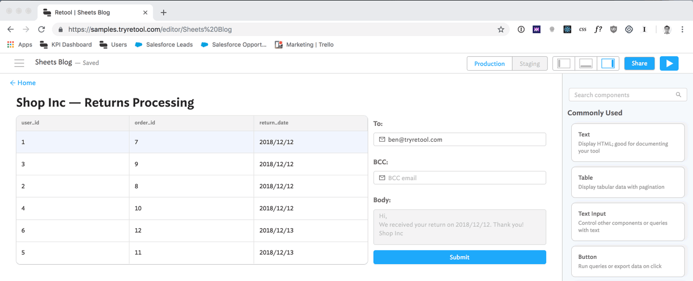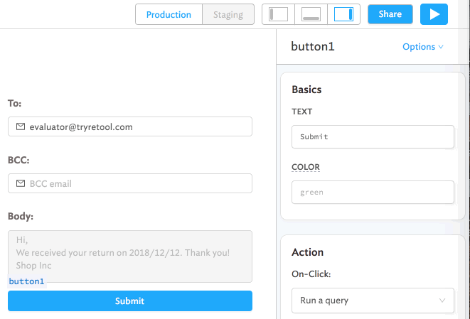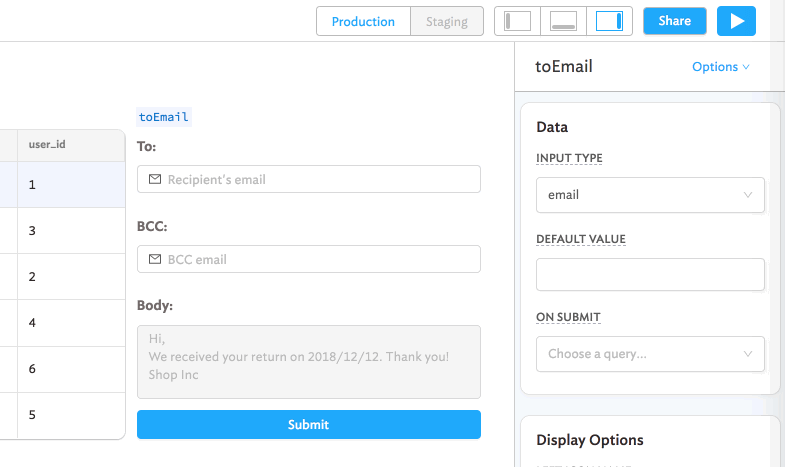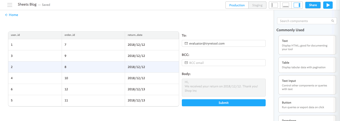 Retool also has components for data entry — from text inputs to JSON editors. For now, let’s build a quick form to send emails to customers, notifying them that we’ve received their return.