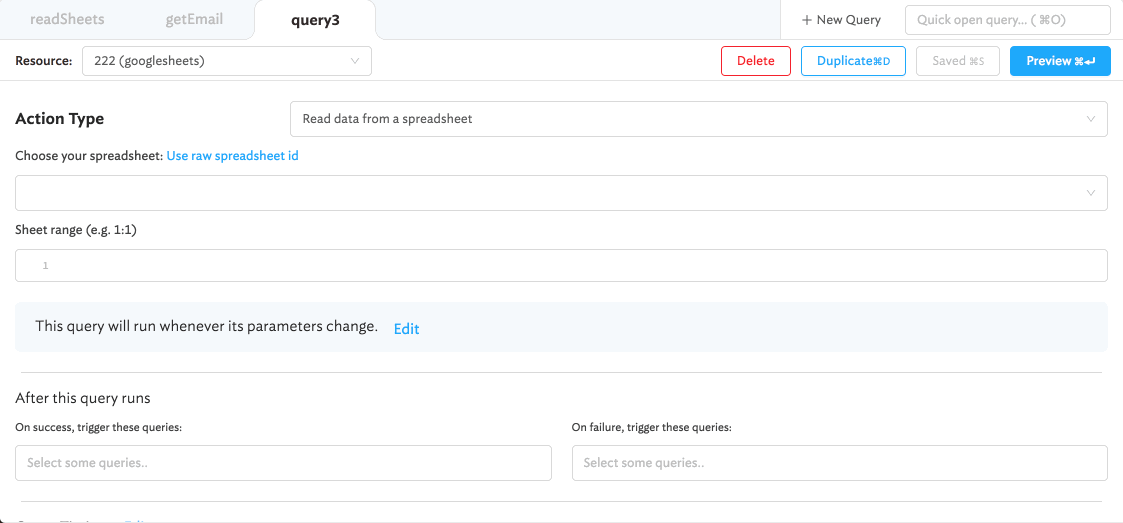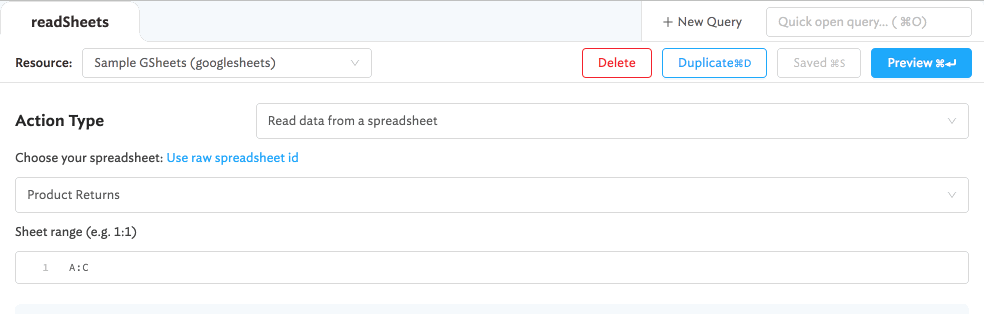 Everything inside Retool is a variable that you can refer anywhere else: readSheets is a query, and returnsTable is a Table. Variables also have fields you can access: like readSheets.data, and returnsTable.selectedRow.data.columnName. We’ll learn more about this in a bit…