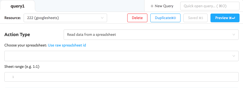Retool integrates with any database (SQL or no-SQL) and API, and has native integrations with dozens of products and services, like Google Sheets. You can connect to your own Sheets by creating a new Google Sheets resource in Retool, but for now, let’s use our sample resource.