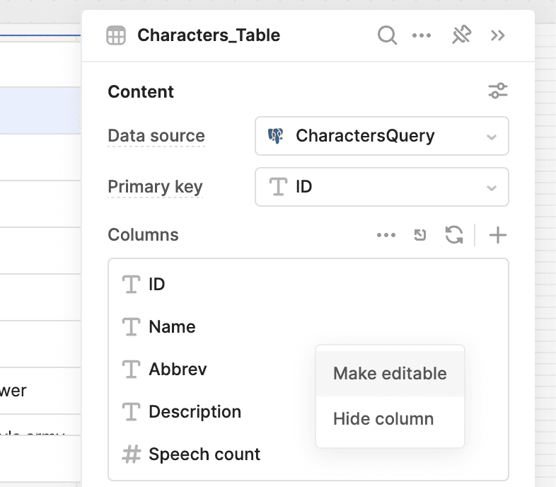 Now, we have a bulk edit query! Next, we need to set the relevant columns that we want to be editable as (...wait for it…) editable in Retool. This is easy to do using the three-dot menu.