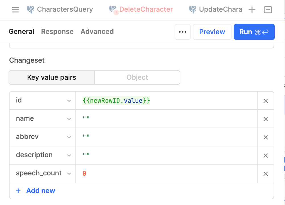 Next, we’ll create another query. We’ll set the table to the character’s table, the action type to inserting a record, and the changeset a single value for the id set to the newRowID.value