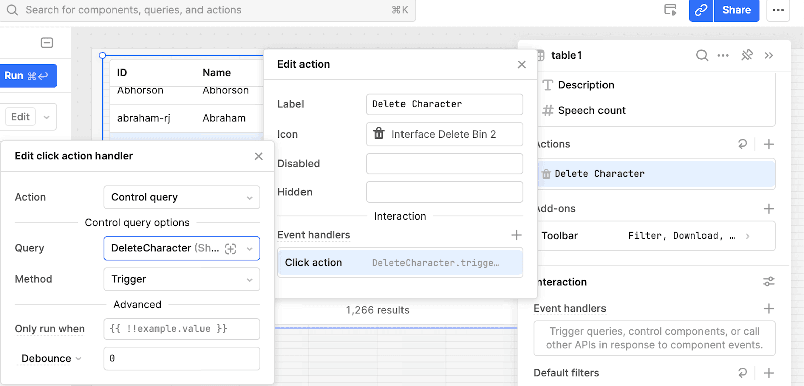 Next, we’ll use Retool’s built-in Actions list to set up an action button. We’ll connect this Action button with the query we just created—because you end up selecting the row when clicking on the button, the Delete feature will work seamlessly: