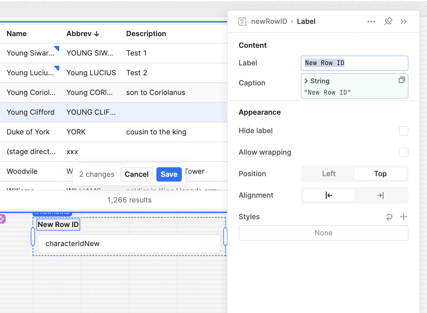 The last major item to make our Retool app the ultimate Postgres GUI is a feature to add a new row. We can make this happen with two user interface components—a text box to set the new row’s ID and a button to create the row.