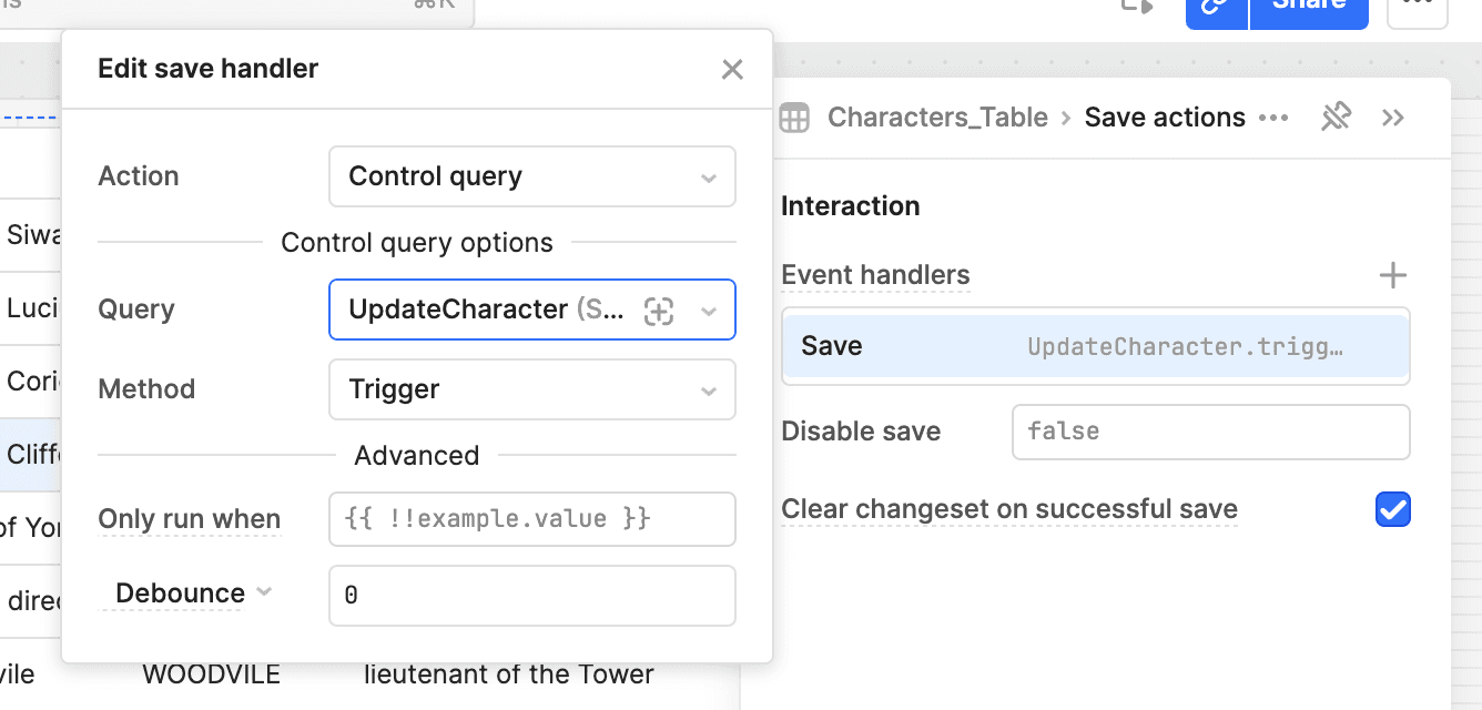 After setting the right columns to editable, we need to connect the query to changes to the table. This is easy to do by creating a Save actions trigger on Add-ons.