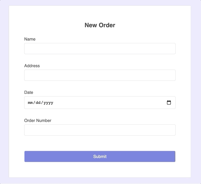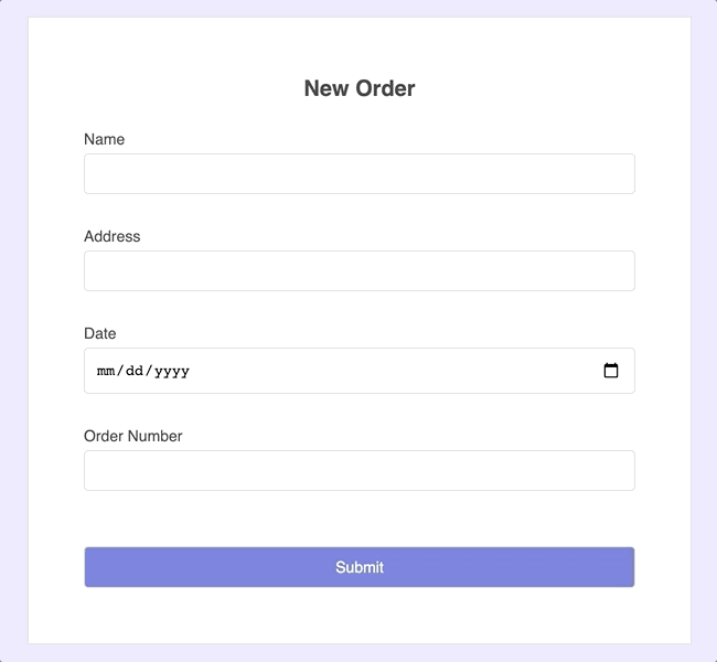 1 2 3 4 5 6 7 8<label>Name</label> <input name="name" ref={register} /> <label>Address</label> <input name="address" ref={register} /> <label>Date</label> <input name="date" ref={register} /> <label>Order Number</label> <input name="order" ref={register} />