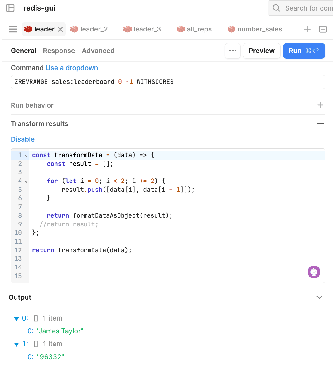 We’ve prepopulated Redis with some sales data for each of our reps. Basically, within Redis, we have:
