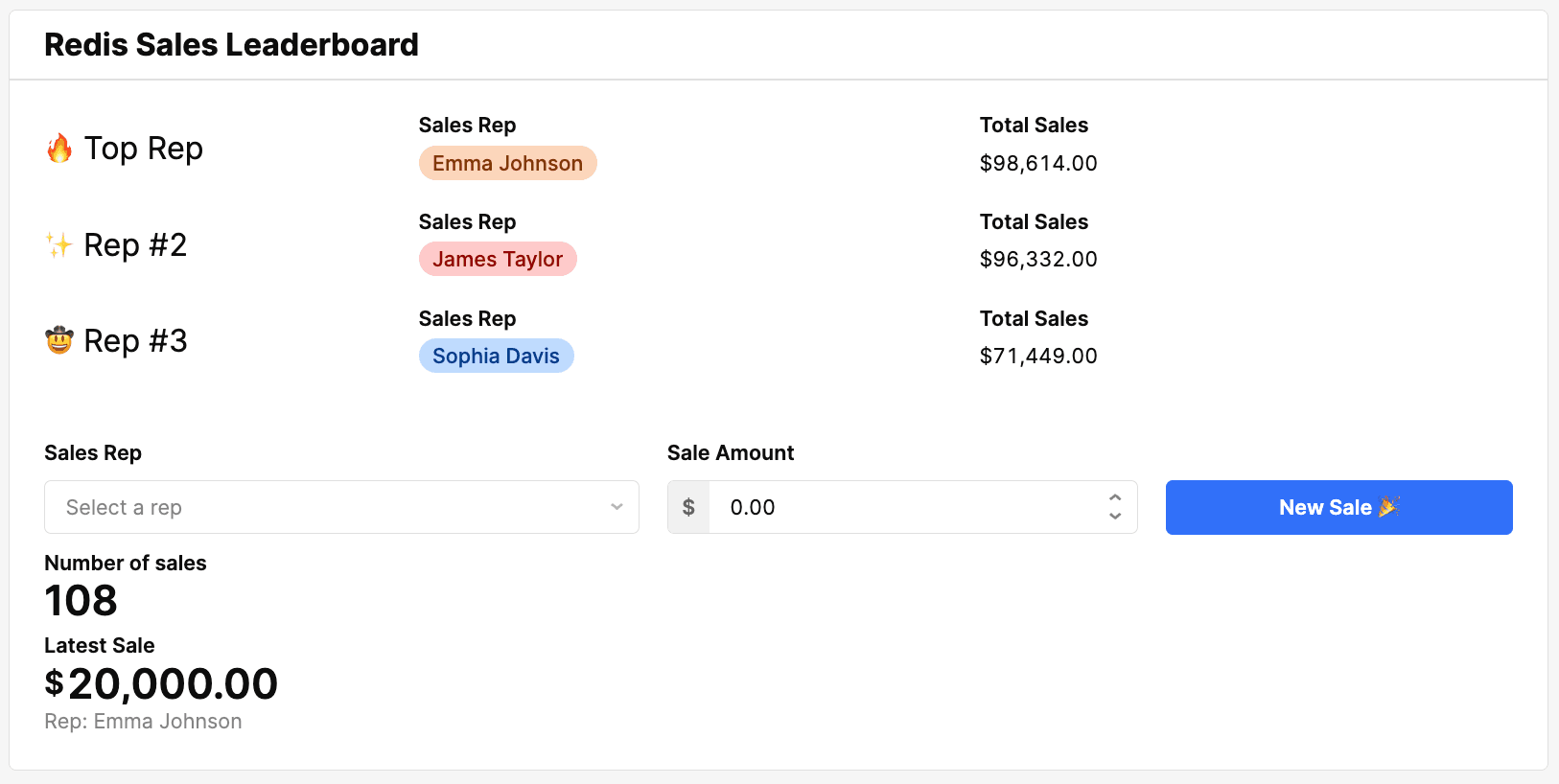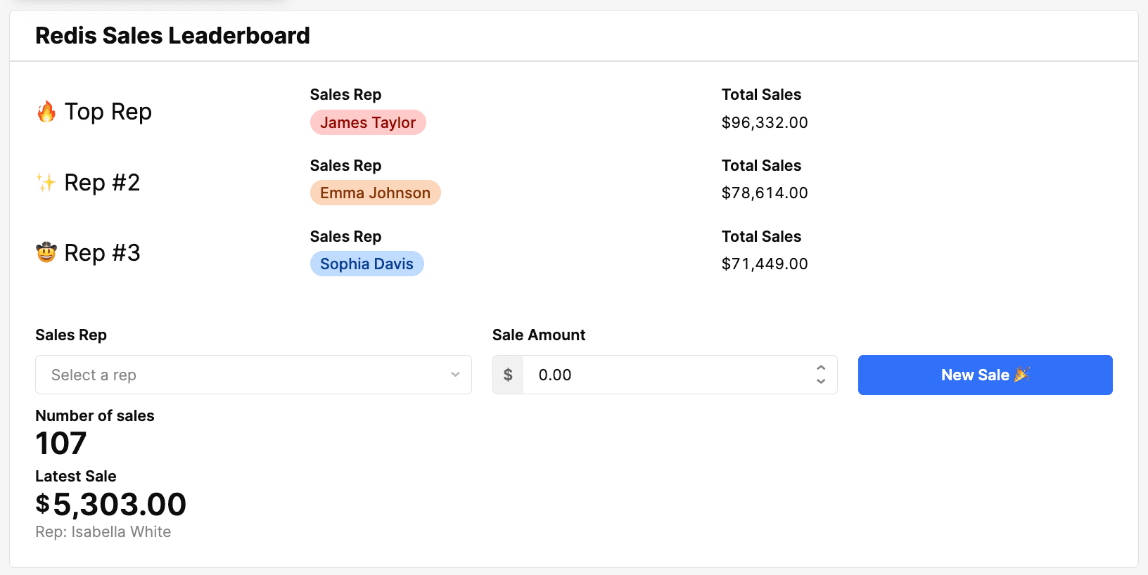 Great! With this, our leaderboard will load our prepopulated data from Redis. But obviously, we want a way to add sales to the database and update the leaderboard. To do that, we will take the rep selected in our dropdown and the amount in the currency field and add them to Redis when the “New Sale 🎉” button is pressed.