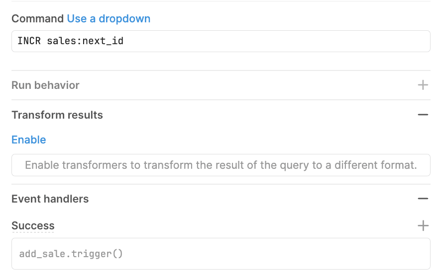 This will create an ID for our new sales. With that ID, we can then set the sales information in Redis. We’ll create an add_sale query that incr_sales will trigger: