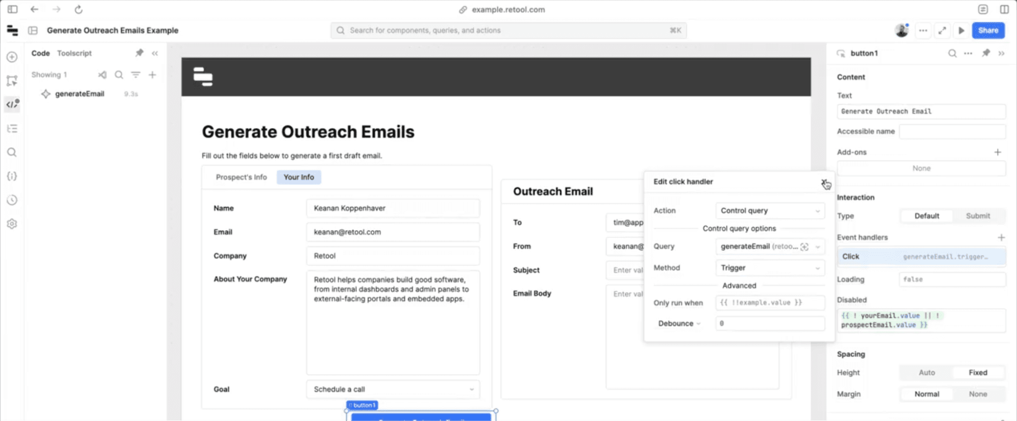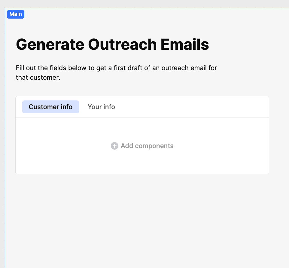 Here, we want to show you how you can do this easily in Retool, building out a custom app to write these emails so you can spend more time on the research. We built a sales outreach email app for the purposes of this tutorial, but you can build similar apps for any kind of outreach.