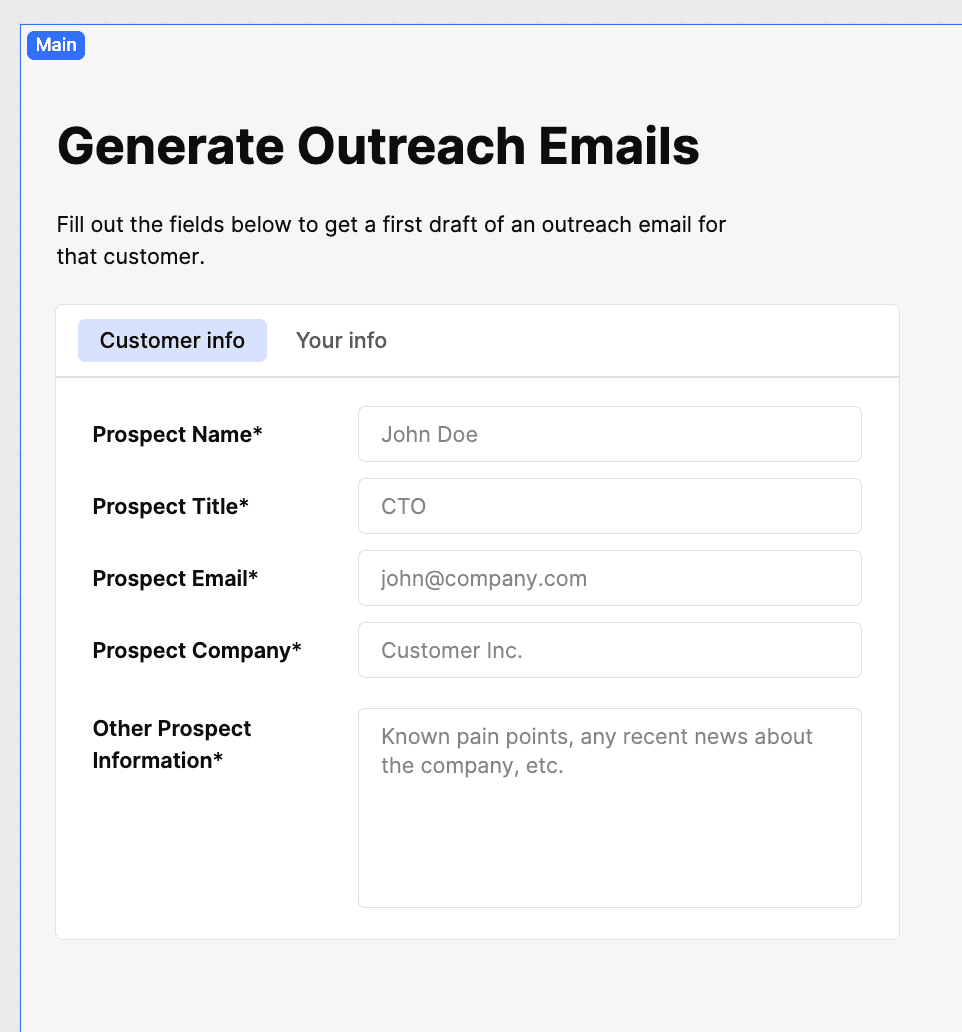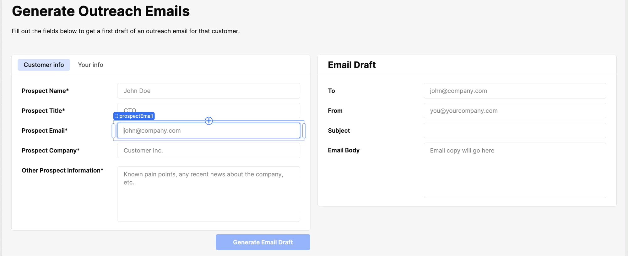 In this case, we want the customer’s name, title, email, company, and any other information about the customer that would help write the outreach email. We create input text fields for each of these, which will act as the values for the parameters in our prompt.