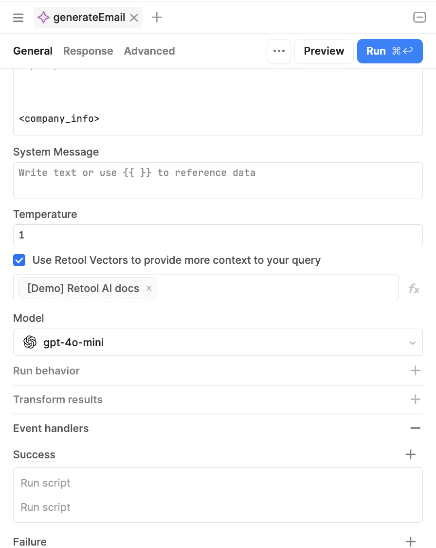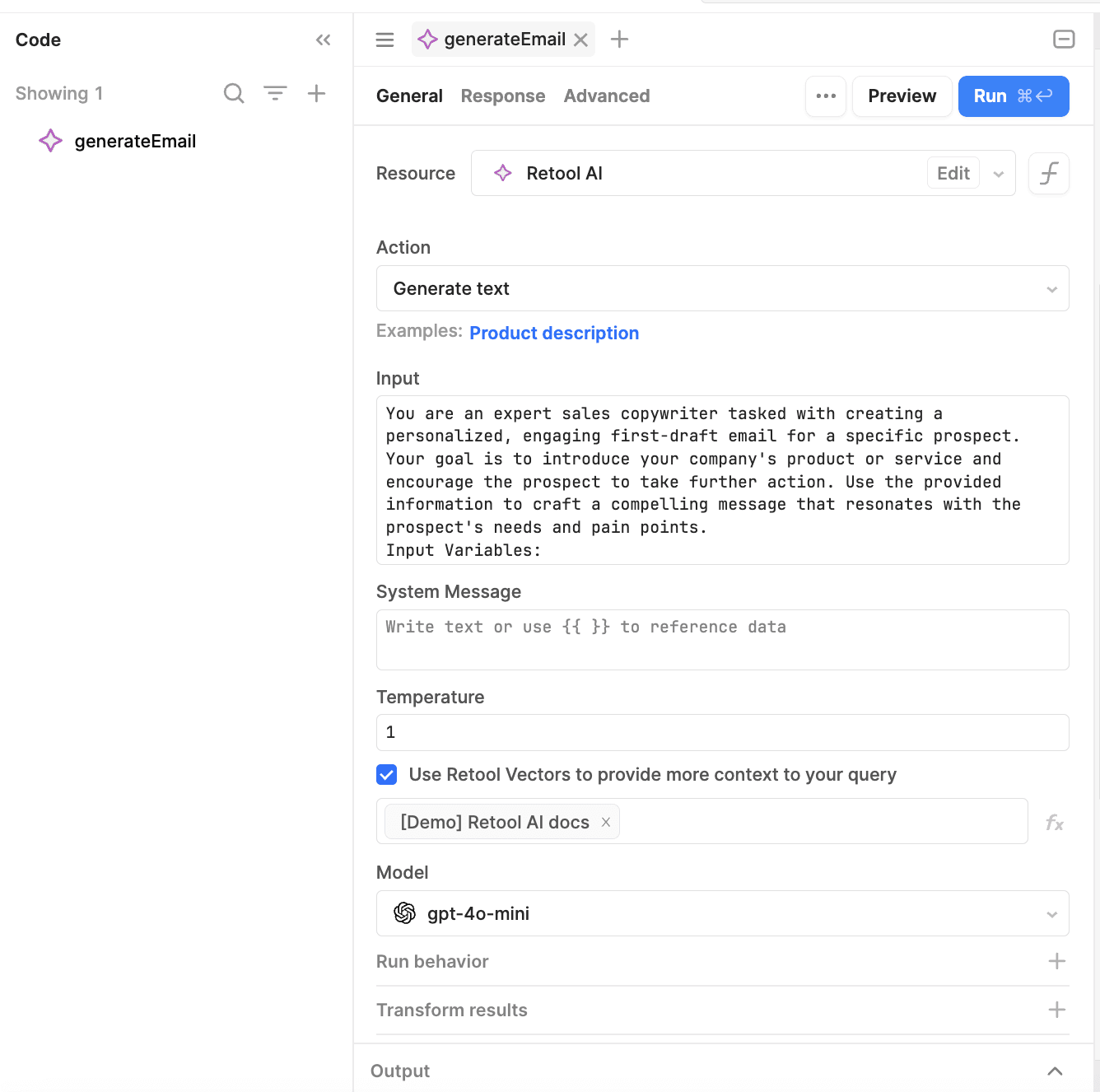 You’ll notice in the screenshot above we’ve also checked the box to use Retool vectors and add the vectors for the Retool AI docs. Vectors are stored mathematical representations of documents that the AI can then pull into its model to give a more specific output. In this case, the emails will talk more specifically about Retool AI, which will be great for targeted outreach emails.
