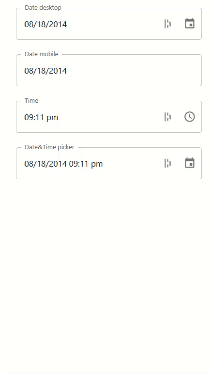 - Date mobile: selects dates with the UI most suitable for mobile devices