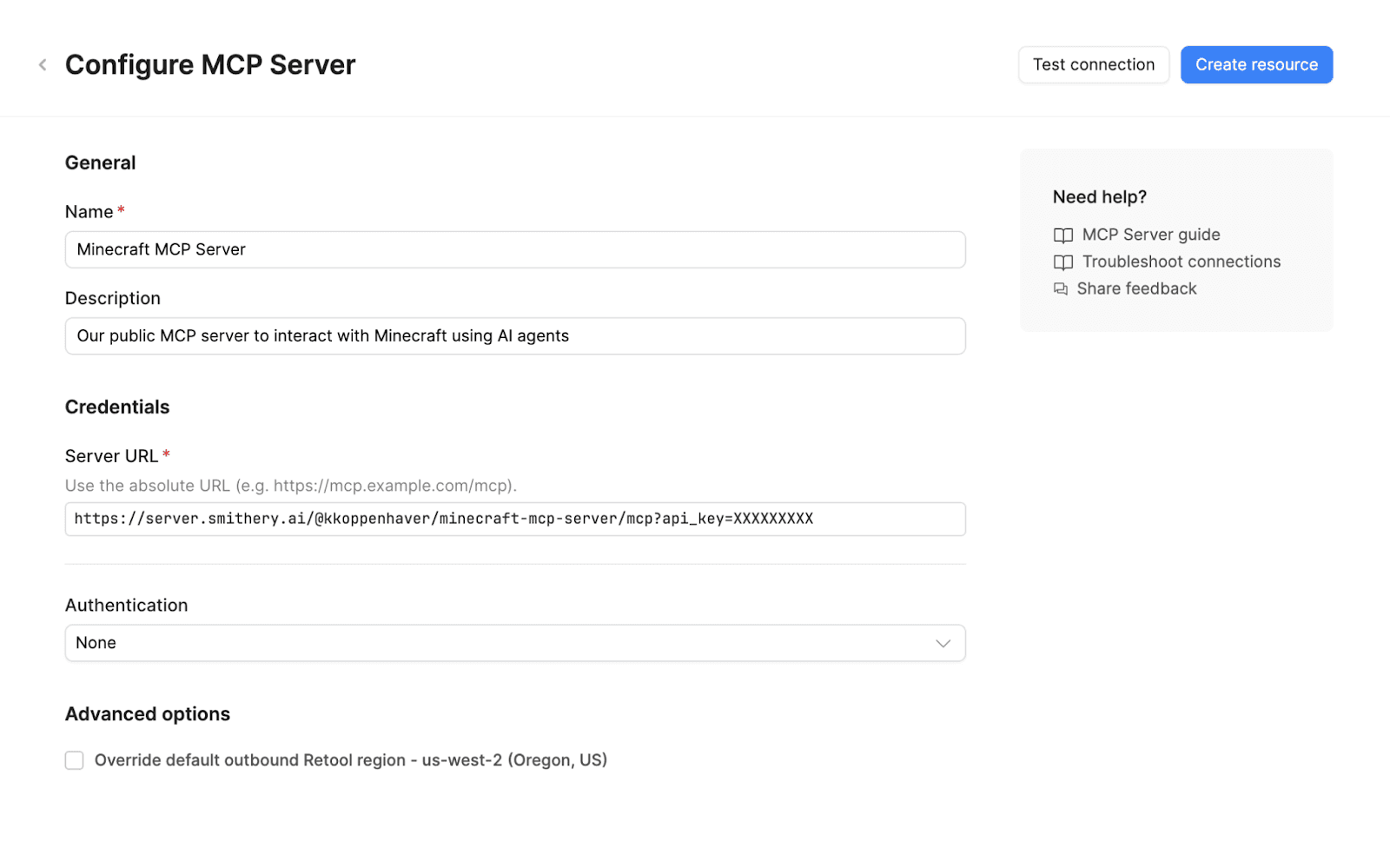 Now that you have a public URL for your MCP server on Smithery, you can set up this server as a resource in Retool and add it to your AI agent.