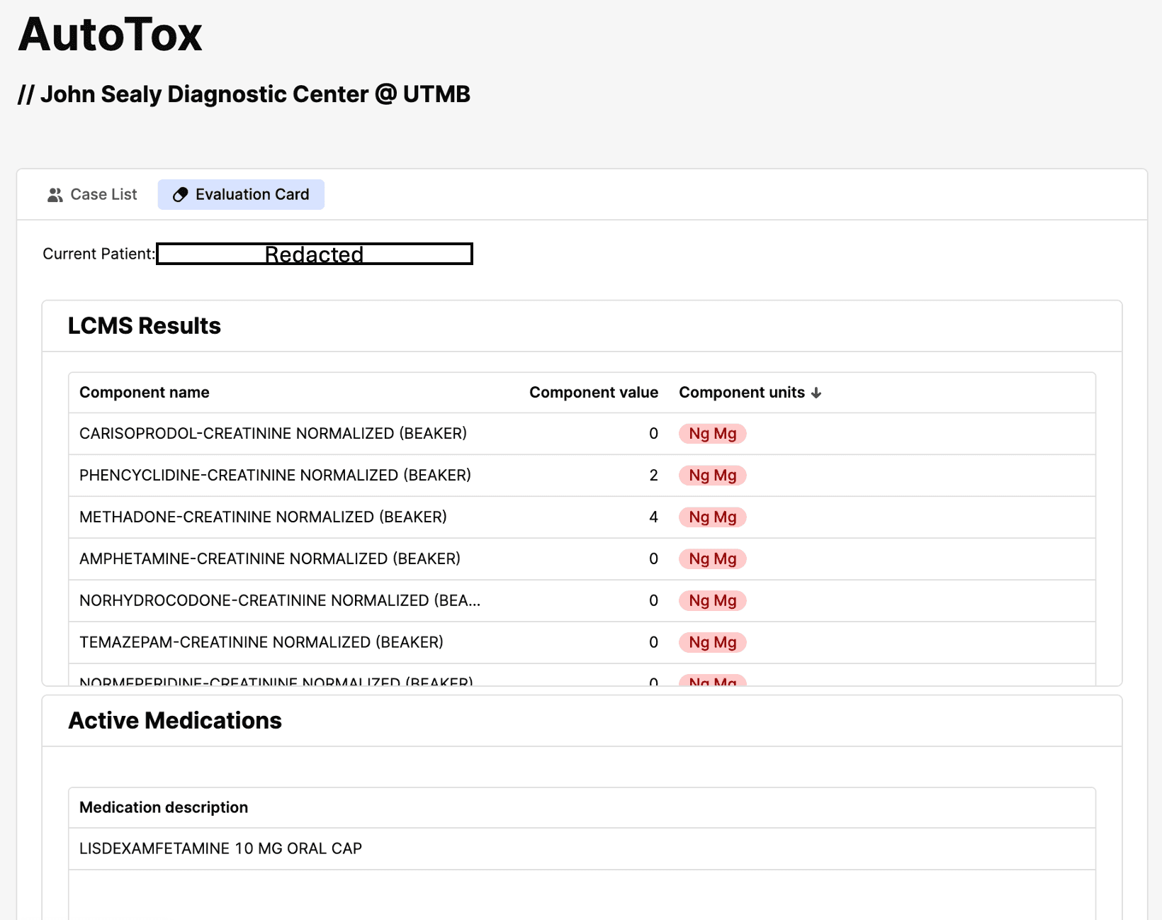 AutoTox presents a case list along with case metadata, test results, and interpretive text for pathologists to review and verify findings (as well as provide feedback on the quality of model outputs). Pathologists can then send these results to the medical record system.