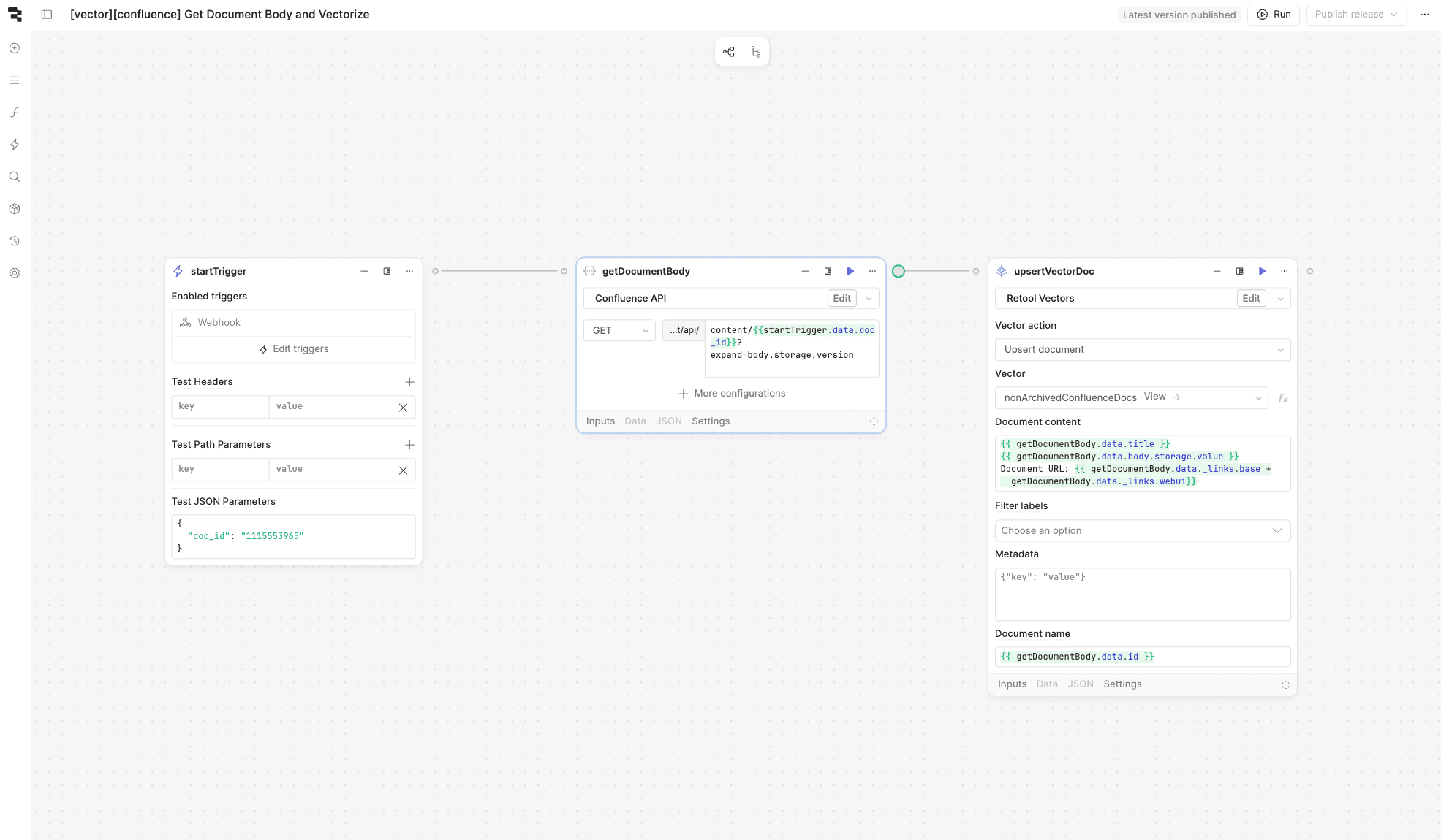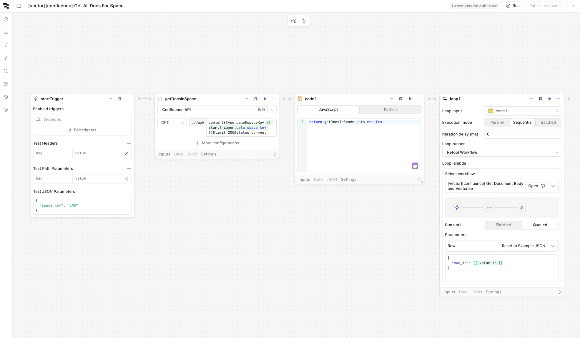 To ingest our Confluence documents, for example, we first query the Confluence API to get a list of all Spaces containing our documents. Then we call a separate sub-workflow to retrieve all documents within each Space.