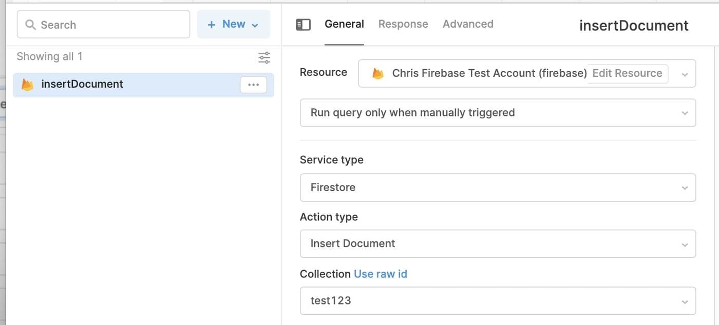 Go to the query panel below the UI canvas. Select the first query on the left side and change the Resource type to the Firebase resource which you created in the beginning of this tutorial. Next, change the service type to Firestore in the first dropdown menu below and change the Action type to Insert Document.