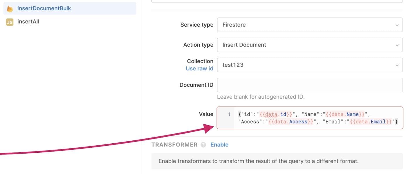 Next, in the value input for the Insert Document query, create a JSON object and keys for each of the fields you want to pass through. For each key value pair, insert curly braces to reference the table data for the row that’s selected. In this example, we’ll reference the email key value, then copy, paste, and modify it for the other two keys.
