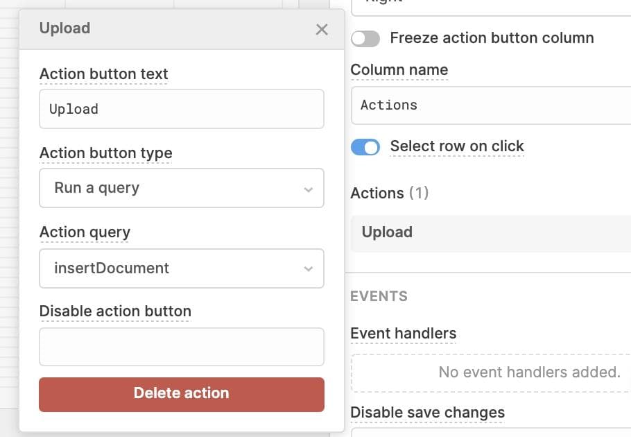 Finally, link the table’s upload button action to the “insertDocument” query, which will trigger the query to execute and upload row data to your resource.