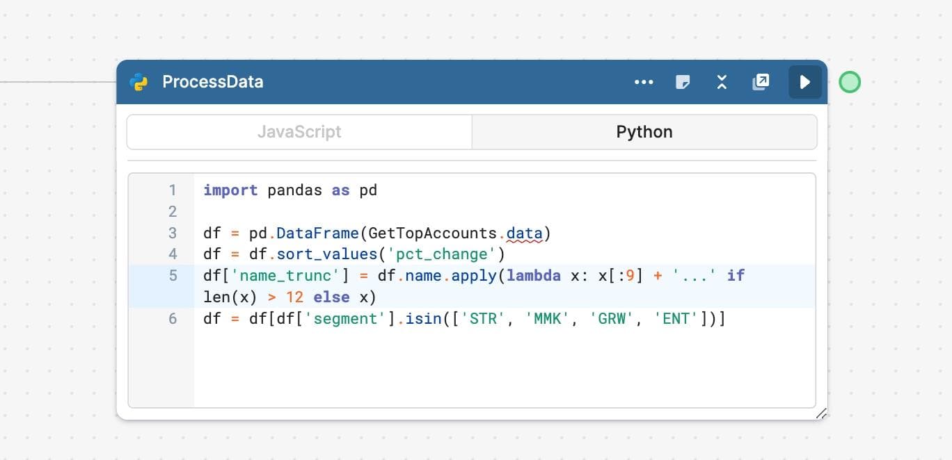 Now, I can swap between JavaScript and Python any time I want to use code blocks in Workflows, meaning I can reach for the right tool for the job at each step in any automation process. Here’s a reporting example: