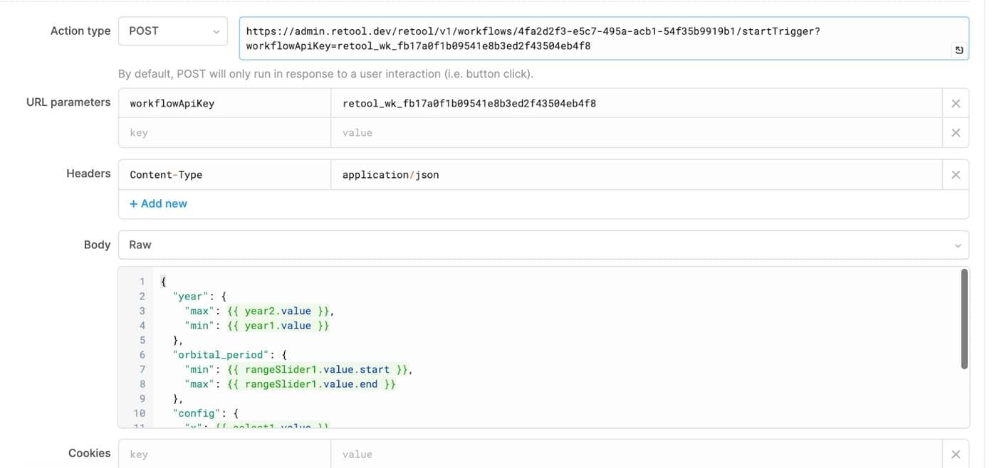 Check out the JSON for this example workflow, and import it into your own Retool instance to see how it works!